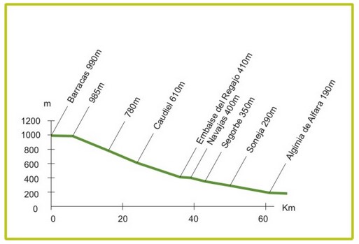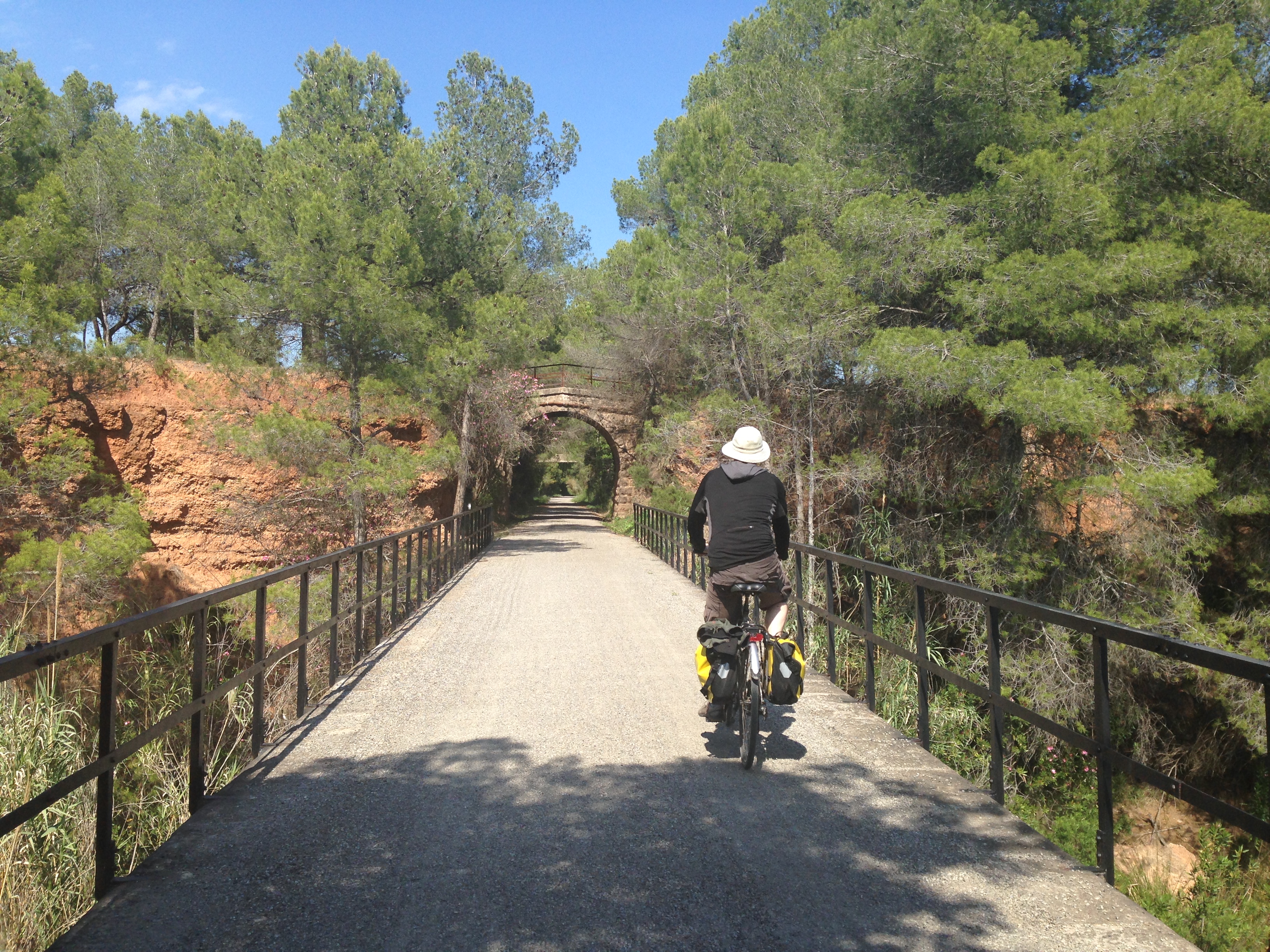 Because this is hilly terrain, there are about five tunnels (the longest is 500 m) and many viaducts over dry river beds and gullies. Up in the hills we have great views, once we’re down in the valley we cycle through orange (I mean the fruit) fields. We regularly see the new railway and the Autovía. The first part is more fun, because there is more nature and less civilization. The road surface is better as well. While cycling done we do a little detour to a famous waterfall and go through the village of Navajas. There are ridiculously big old houses here and a charming town center with narrow streets. The waterfall is a little further than anticipated, way downhill and not very impressive. A good cardio exercise to climb back up to the Via Verde trail is the silver lining.
