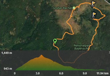 The road to Gfäll is the only summer road that is still open, all other roads to summer parkings are closed due to snow. We follow the GPS up via Spiegelau and drive slowly to the parking lot over a small road with a thin layer of snow. We set off with a ‘light’ clothes setting, since we suspect the climb to the Grosser Rachel will keep us warm. Again it’s a wide forest road, obviously recently used by a vehicle. The compressed snow is very slippery in places so we have to watch our footing. We do not see another soul all the way to the top, though the many footsteps prove that there is some passage. We climb 500 m over 3.5 km, which requires numerous stops to catch our breath and to let our heart rate drop back to normal. During the climb mine averages 135.