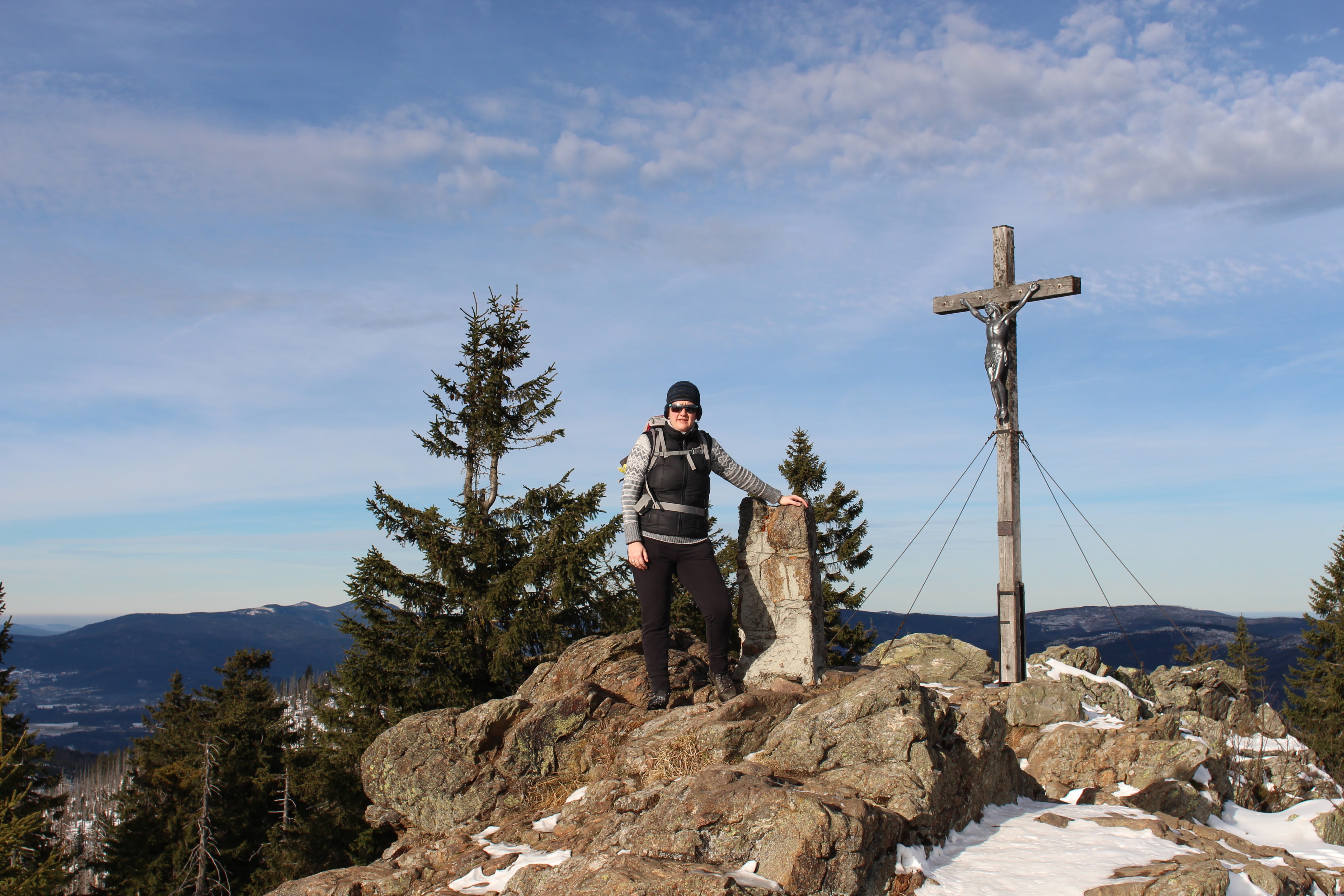 We have some nice views of the top ahead and the snowy slopes, the Alps seem much closer today and cover the entire south horizon. At the Rachelschutzhaus just below the top we share one of the Eat Natural fruit and nut bars and some hot tea. We encounter the same guy we already saw at the parking lot, he must be 60 but took the long way up and still got there before us, as far as we can understand through his strong accent.