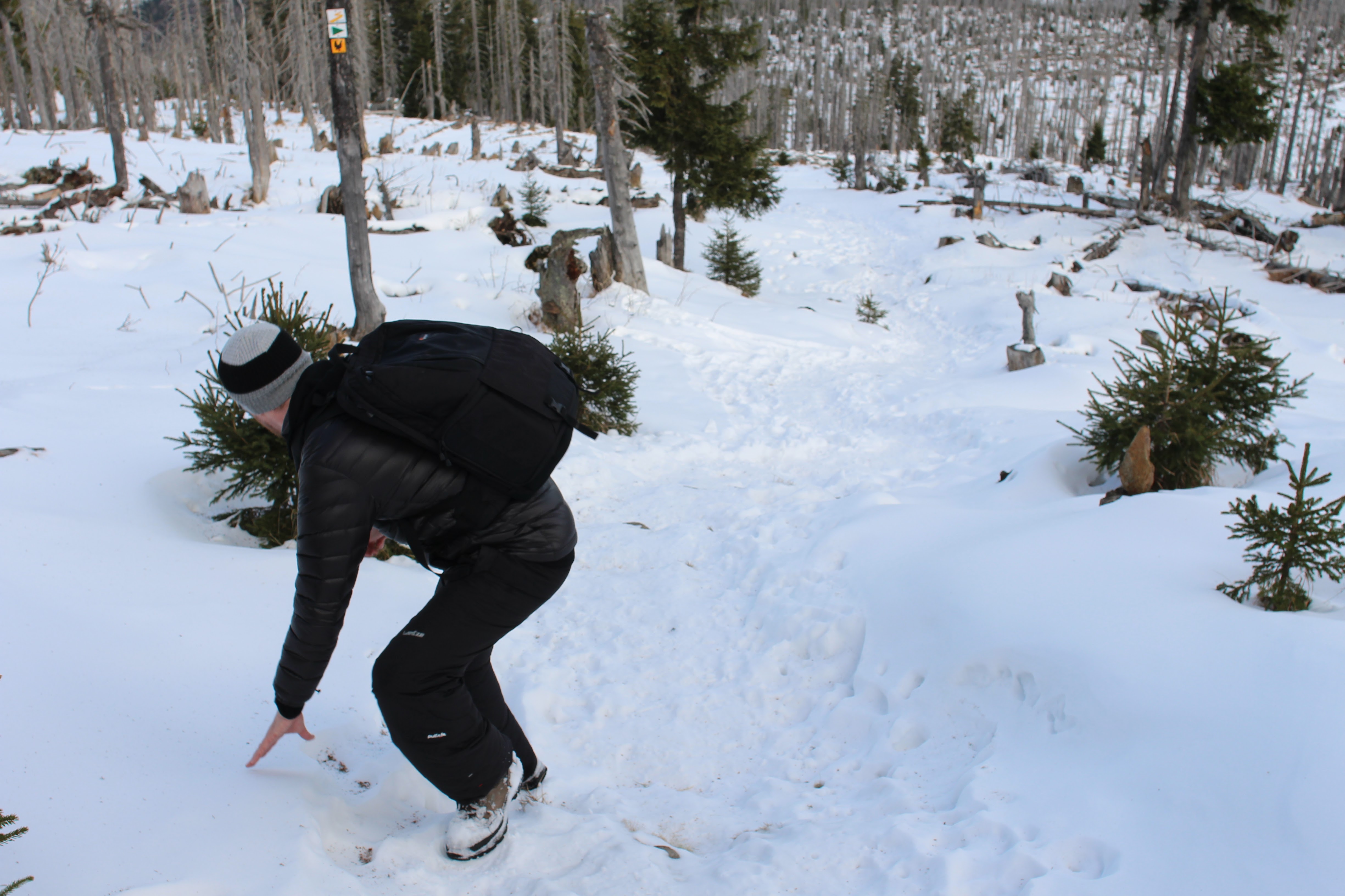 The view from the top is a bit encumbered by the trees, so we don’t stay long and start the steep descent towards the Rachelsee. The way down is a hiking trail that is completely covered in snow. We can follow the footsteps but we cannot see what’s under the snow, so the trick is to throw out your foot, slide it until you find a non-moving object and then move your weight forward.
