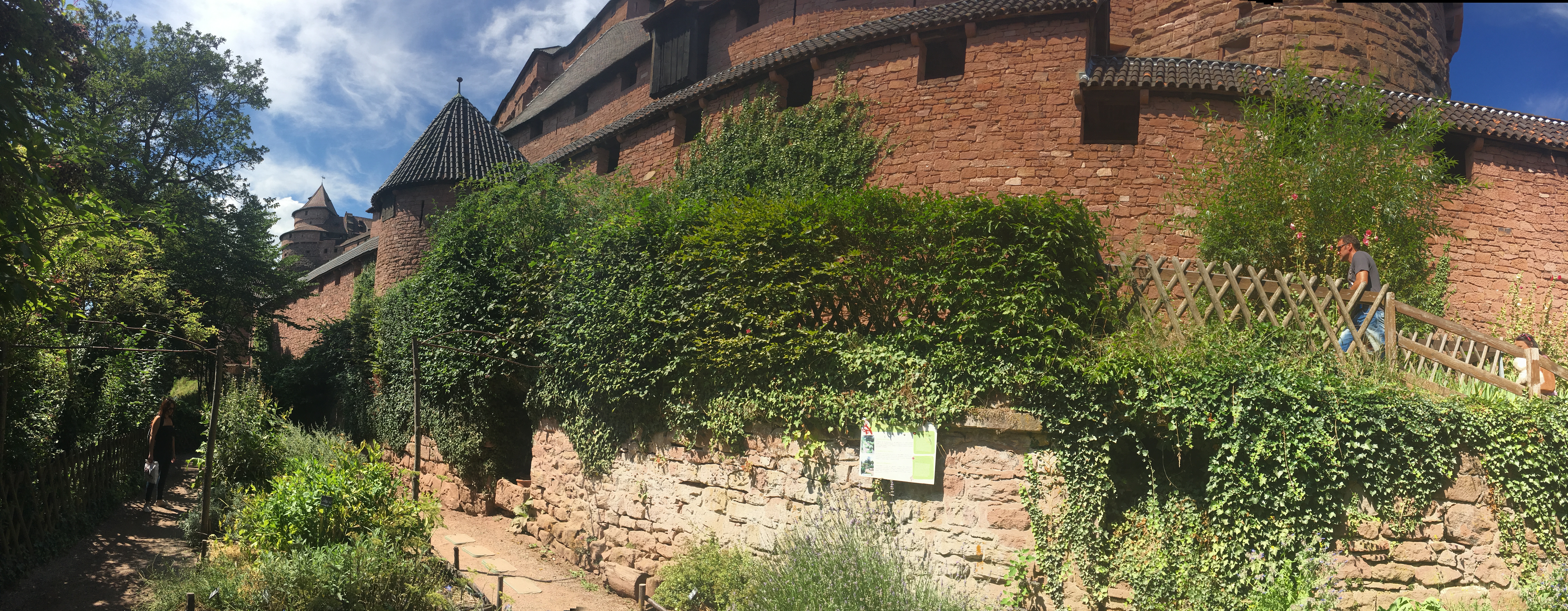 We retrace our route and drive through the hills/mountains to get to Château du Haut-Koenigsbourgh. We were forewarned by the books that this is a very popular tourist destination, there are a lot of parking spaces but all full so we park by the road with all the others and hike up following a forest track. Impossible to get lost, the castle occupies the whole top of the hill. It was a medieval castle with a long history but fell into ruin later, only to be completely rebuilt/renovated at the end of the 19th century. You can’t say it’s authentic, but it’s at least very impressive.