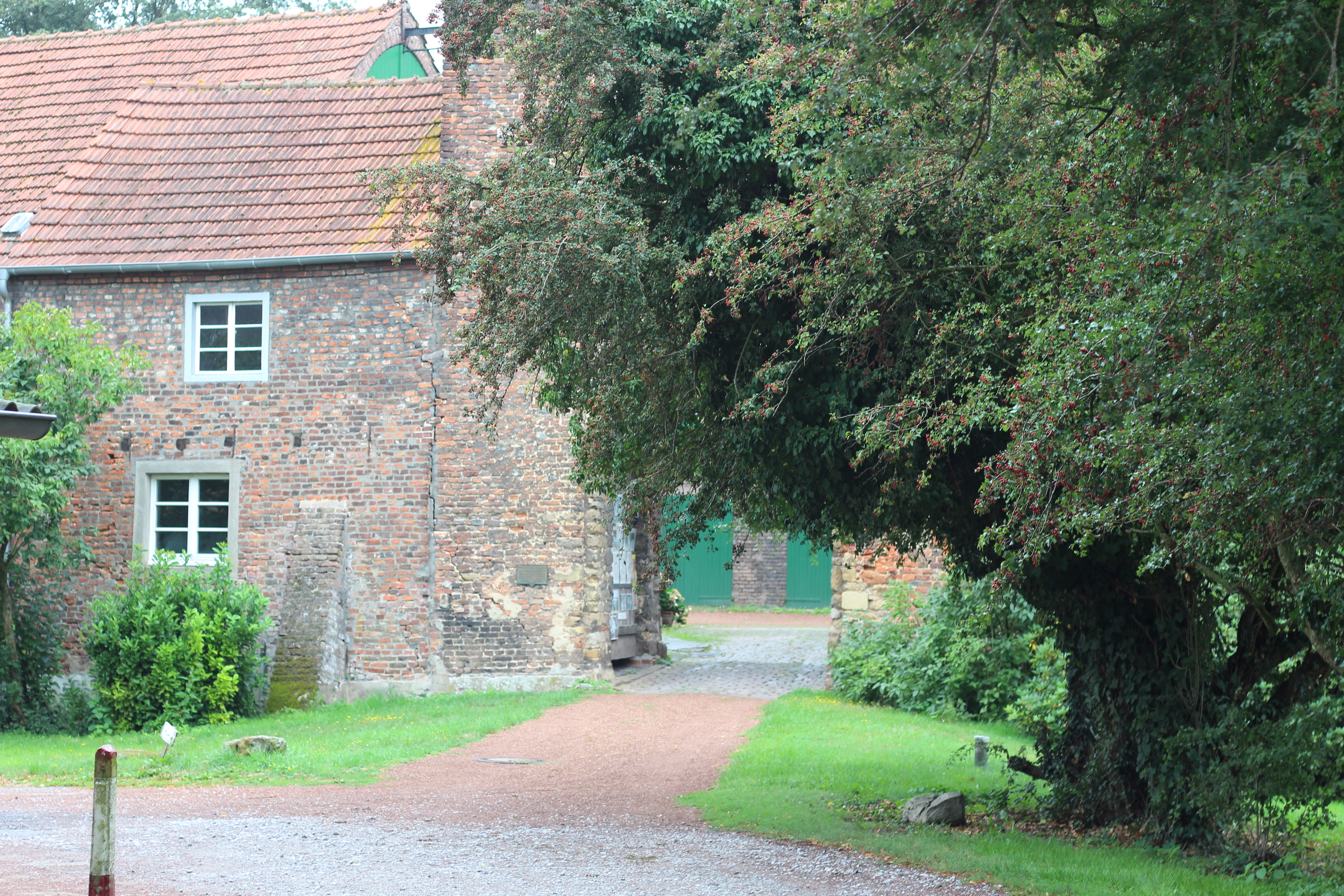 Onwards! We follow the gravel bicycle routes from one number to the next all the way to Schermbeck, cycling through the green lint surrounding the lenght of the Lippe river. For a long while we cycle along the same railway that we also encountered the day before yesterday, when we admired the remains of the 19th century brick railroad bridge over the Rhein river, destroyed during the second world war. In Schermbeck we find a bakery that has some indoor seating, we order our favourite unhealthy snacks (in my case a Rosinenschnecke and a hot chocolate) and enjoy the short break.