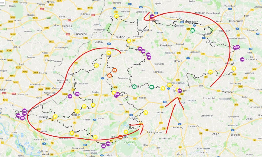 The route is easy this time, we’ll follow the ‘100 Schlösser’ tour around Münster, Germany, should be a relatively easy and relaxing trip: not too many steep inclines and not too many people. It’s a total of 1000 km but we’re doing half with a bit of improv, we’re estimating to end up with about 550 km at the end of 9 days. Seems slow, but you have to take into account the 100 castles (Schlösser in German) strewn along the route. I’m supposing since we do half the trip, we’ll get half the castles. Expect many pictures of big old buildings against a green back ground. If you’re interested in the (German) folder, follow this link.