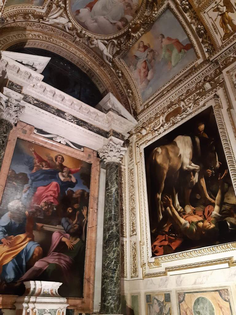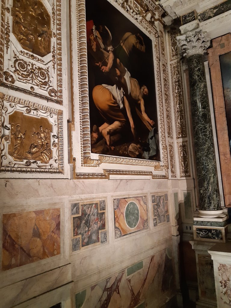 Oops, forgot to put an alarm. Even so, we’re up at half past seven and out just after eight. We take a general aim east and start walking, keeping an eye out for a good spot for breakfast. It’s cloudy, but not actually raining, though most people have rain jackets on or carry umbrella’s. It’s not very cold though, so we sit outside in a t-shirt on a terrace to have our quick breakfast. On towards Piazza del Popolo. Lots of people walking around here, again lots of runners with numbers pinned to their shirts too. There is another ancient obelisk on this huge piazza, surround by a beautiful view of the old town gate to the north, a few churches and the treeline of Pincio hill. While looking up the history of the obelisk, we notice that one of the churches here is famous for its Carravagio paintings. There is no mass in the church at the moment, so we spend some time looking at all the paintings and marble statues dotted around church interior. Entrance is free, but if you want to put on the lights in the chapel with the Carravagios you must drop 2 Euros in a little machine nearby. We share the cost with a young lady who also doesn’t have enough coins and enjoy the beautiful art work for five minutes until the light goes out.