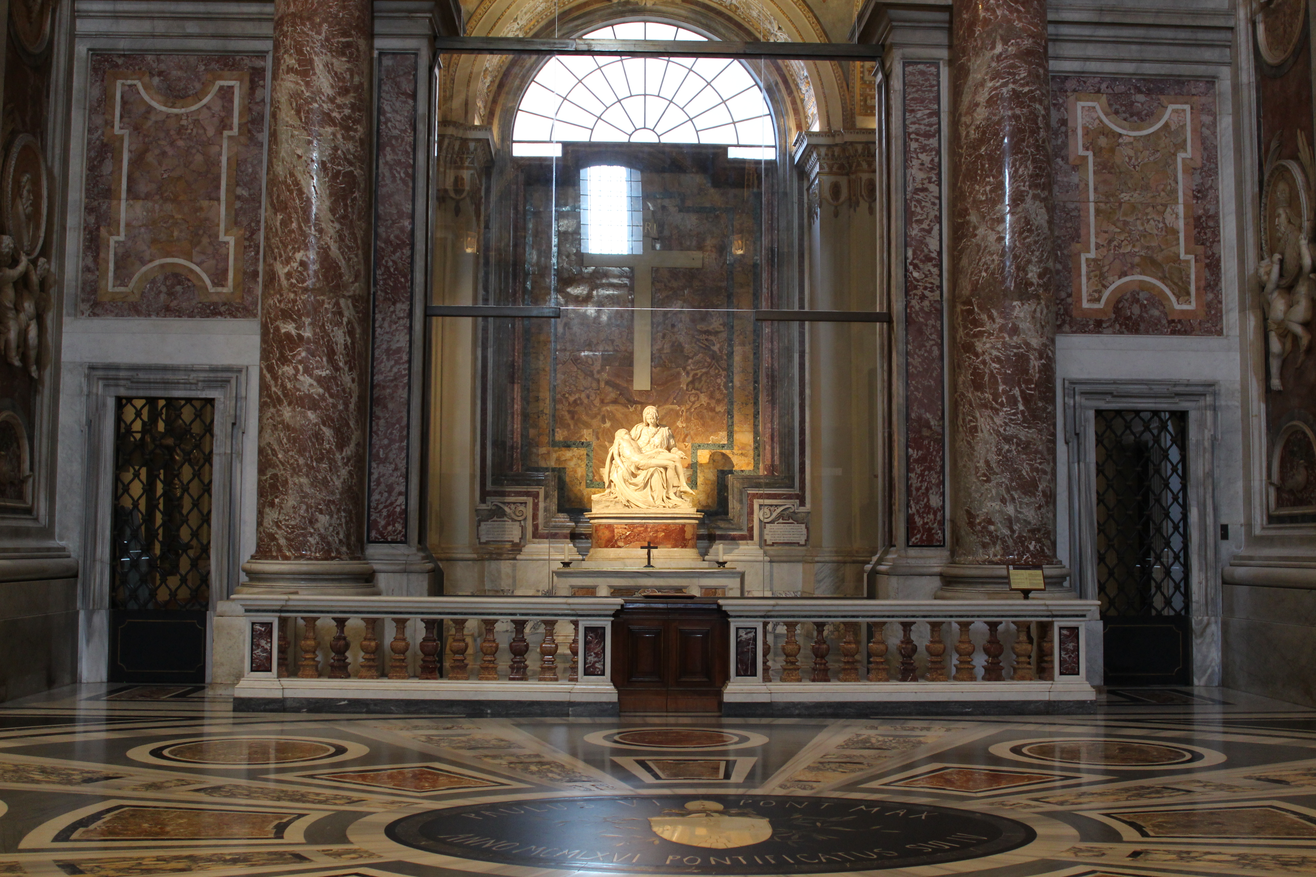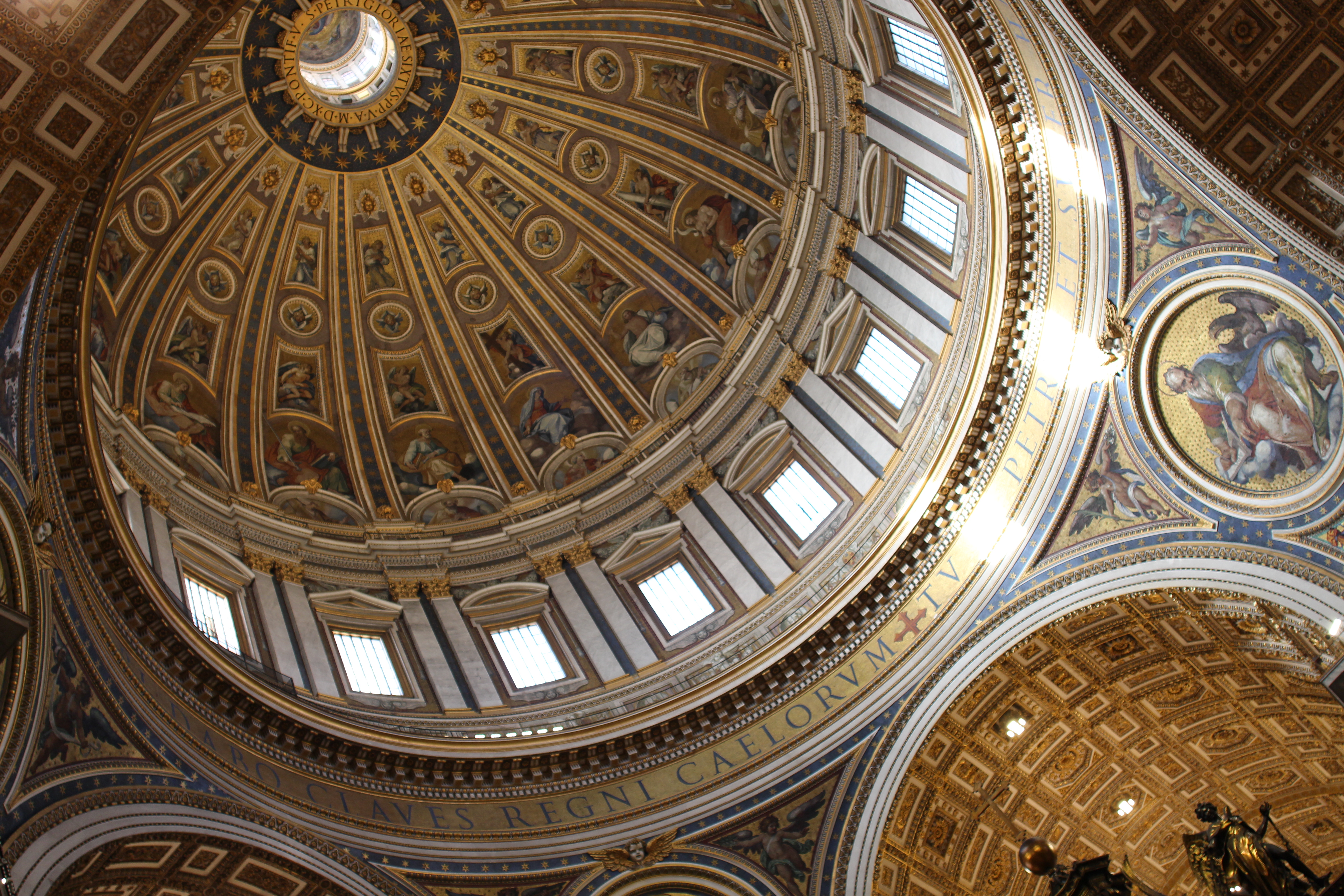 Today is our last day in Rome.. Up at six thirty, packed/checked out and walking before eight. We don’t have a particular goal in mind, but the weather is beautiful so we’ll probably spend most of the morning outside. The only time constraint is our shuttle to the airport at two pm. We walk past Castel Sant’Angelo towards Saint Peter’s square, where the basilica is superbly lighted by the morning sun. No queues this morning, so we decide to visit church, it’s about the only must-see in Rome that we haven’t seen yet. It takes us three minutes to navigate the space reserved for the queue and get through the check point, to enter into the vast church itself. At the moment it is virtually empty, no seating for mass or praying except in some secluded chapels that are not accessible for tourists. The empty floor emphasises the enormity of the space: the nave is really really long and the ceiling really really high. We admire the many fine (and really big) sculptures, in particular the Pieta by Michelango, though nobody is allowed close. The ceiling is beautiful, coffered and gilded in some placed, painted with frescoes in others.