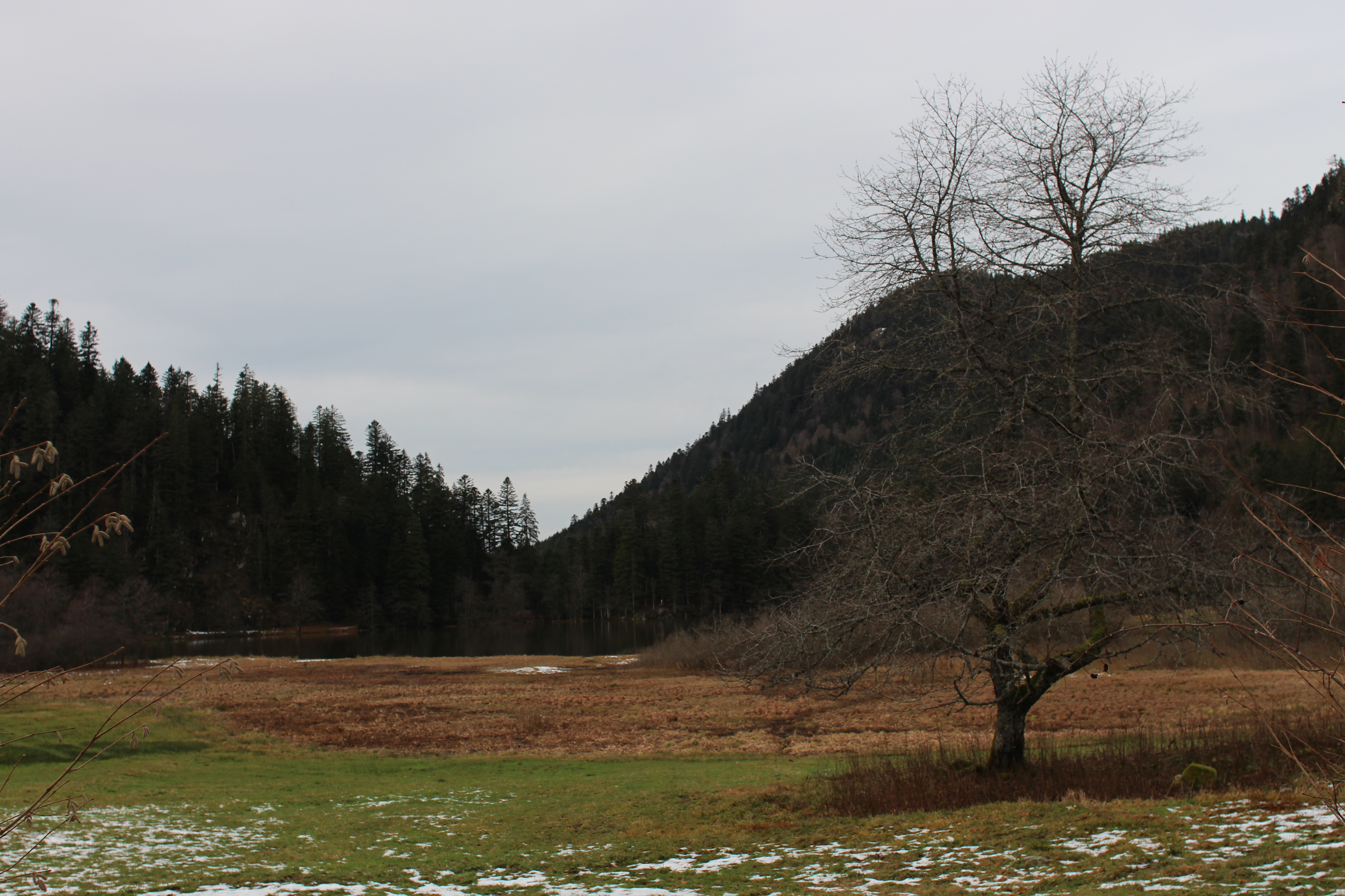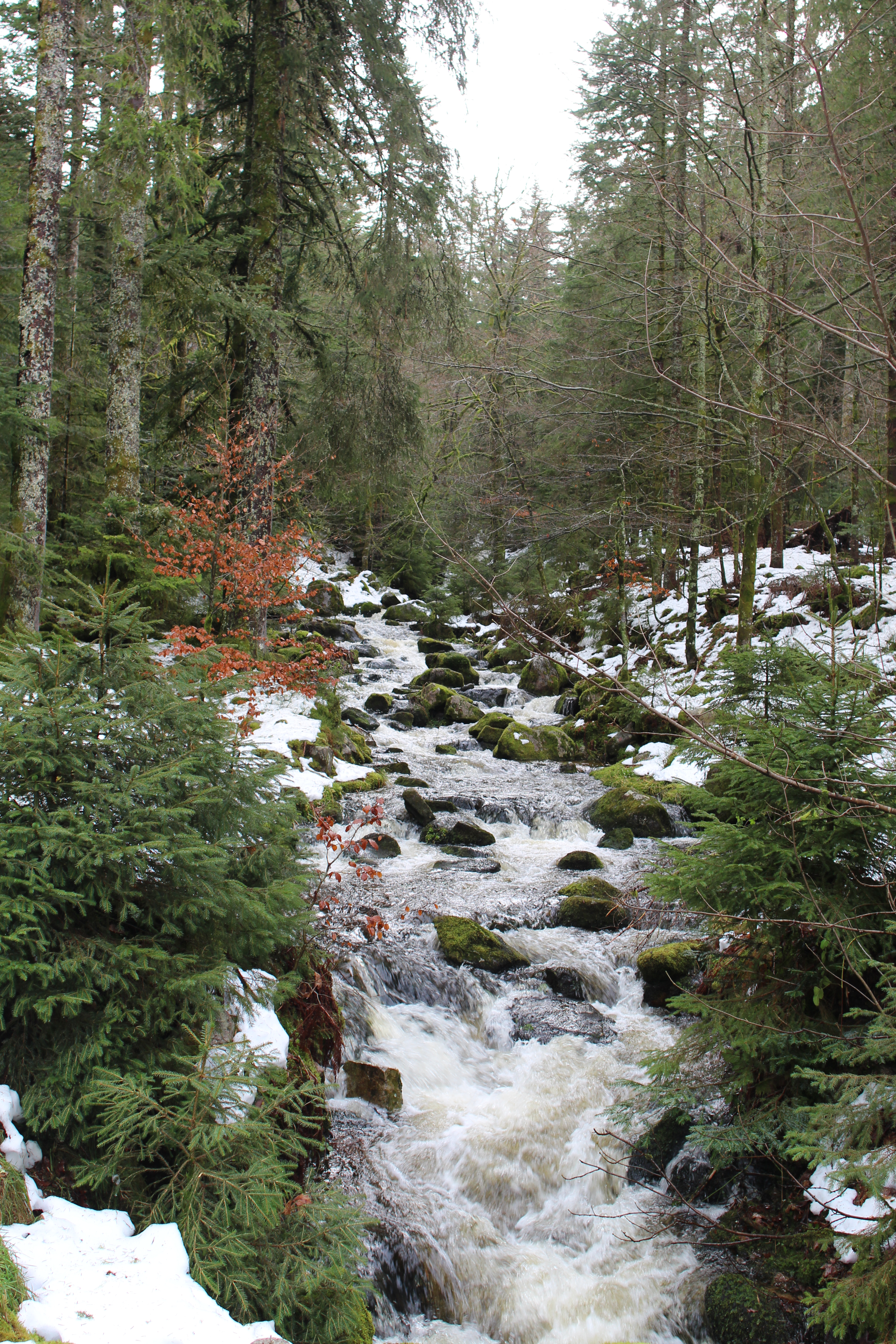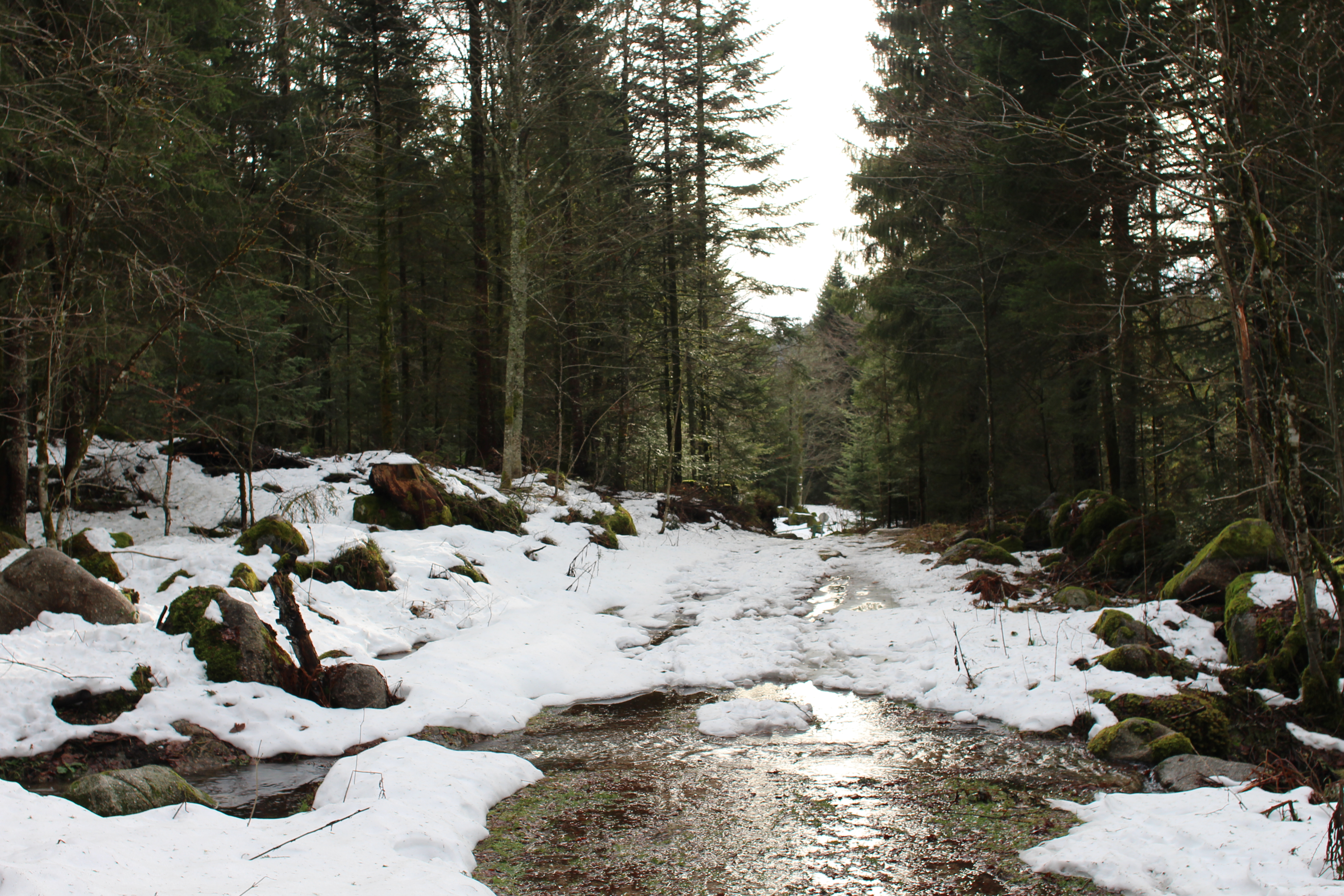 There is some snow on the higher slopes, but it too is very wet and soggy. Mostly everything is very green: evergreen trees, moss and grasses everywhere. At the point where the trail turns back, we decide it’s just getting fun and decide to make a bigger loop following La Trois (The Three), going up to Les Hautes Vannes at 993 m, before going back down and following the river all the way back. We make a small navigational error and end up following a cross country track for half a kilometer before finding our hiking path again, but we figure the snow is melting anyway and nobody will mind our messing up the already patchy track. We have our pick-nick just after noon sitting on some mossy rocks, still completely alone and without having seen another soul. We do encounter some trace of souls: deer scat, squirrel tracks in the snow. Even an actual squirrel near the end of the walk.