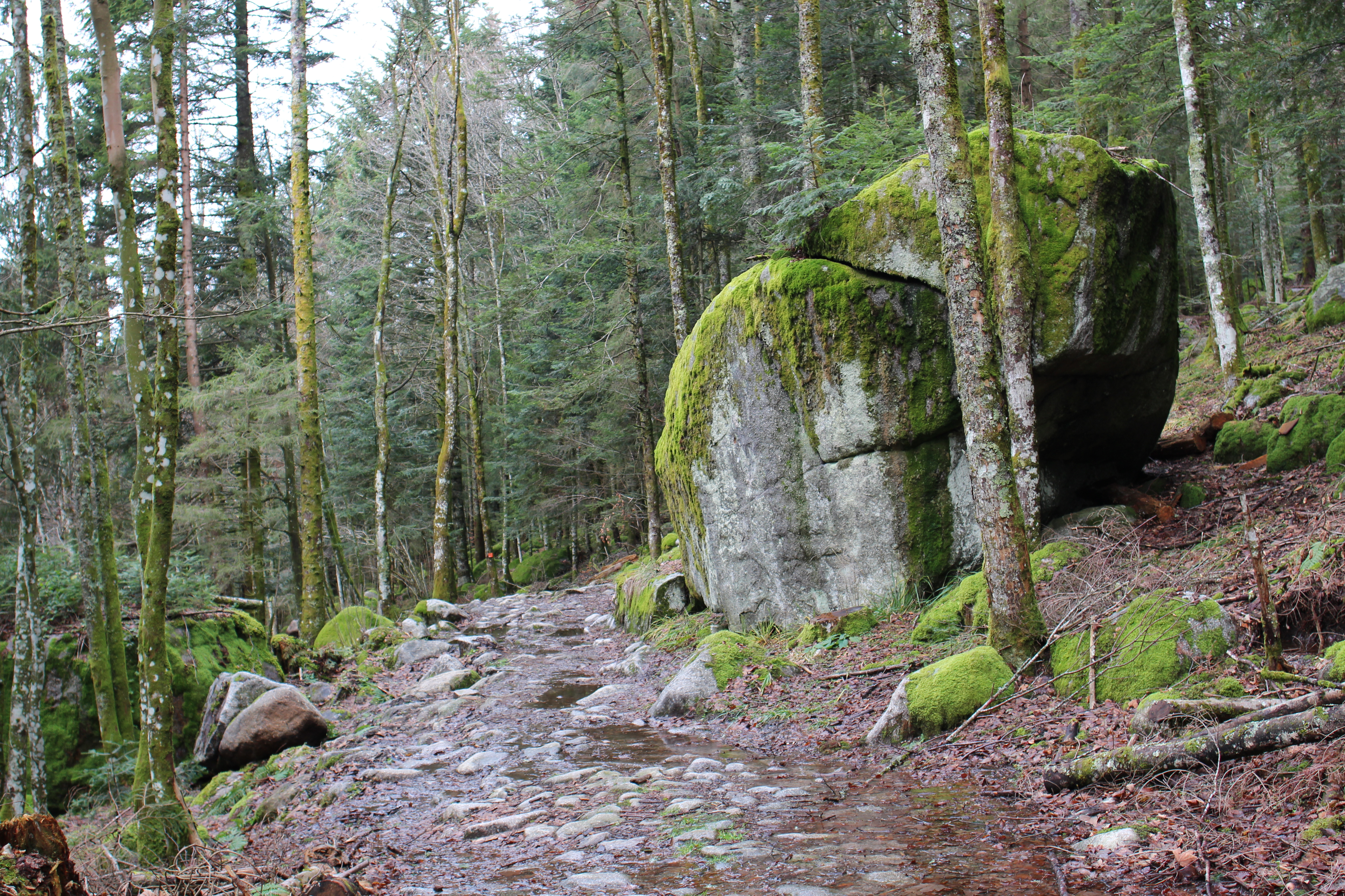 It’s only 1 o’clock, so we decide to do another short hike. We stop by the tourist office to get some flyers about hikes around Gérardmer, find out it’s pronounced [ʒeʁaʁme], whereas Longemer is pronounced [lɔ̃ʒmɛʁ] can you believe it, then drive to aforementioned Longemer. We do a quick stop on the way to get more lunch ingredients for tomorrow and park the car near the camping by the lake. We follow the wide road to Retournemer, again surrounded by the sound of water rushing down from the slopes to join the swollen river below. The road is easy, but has a continuous slight slope upwards so I’m continuously slightly out of breath. On the way, we admire both the view and the sound of the Cascade de Retournemer – Notre Dame des Neiges, the large waterfall leading from the Retournemer lake. We skirt the lake and continue upwards towards the Cascade Charlemagne on the same Vologne river.