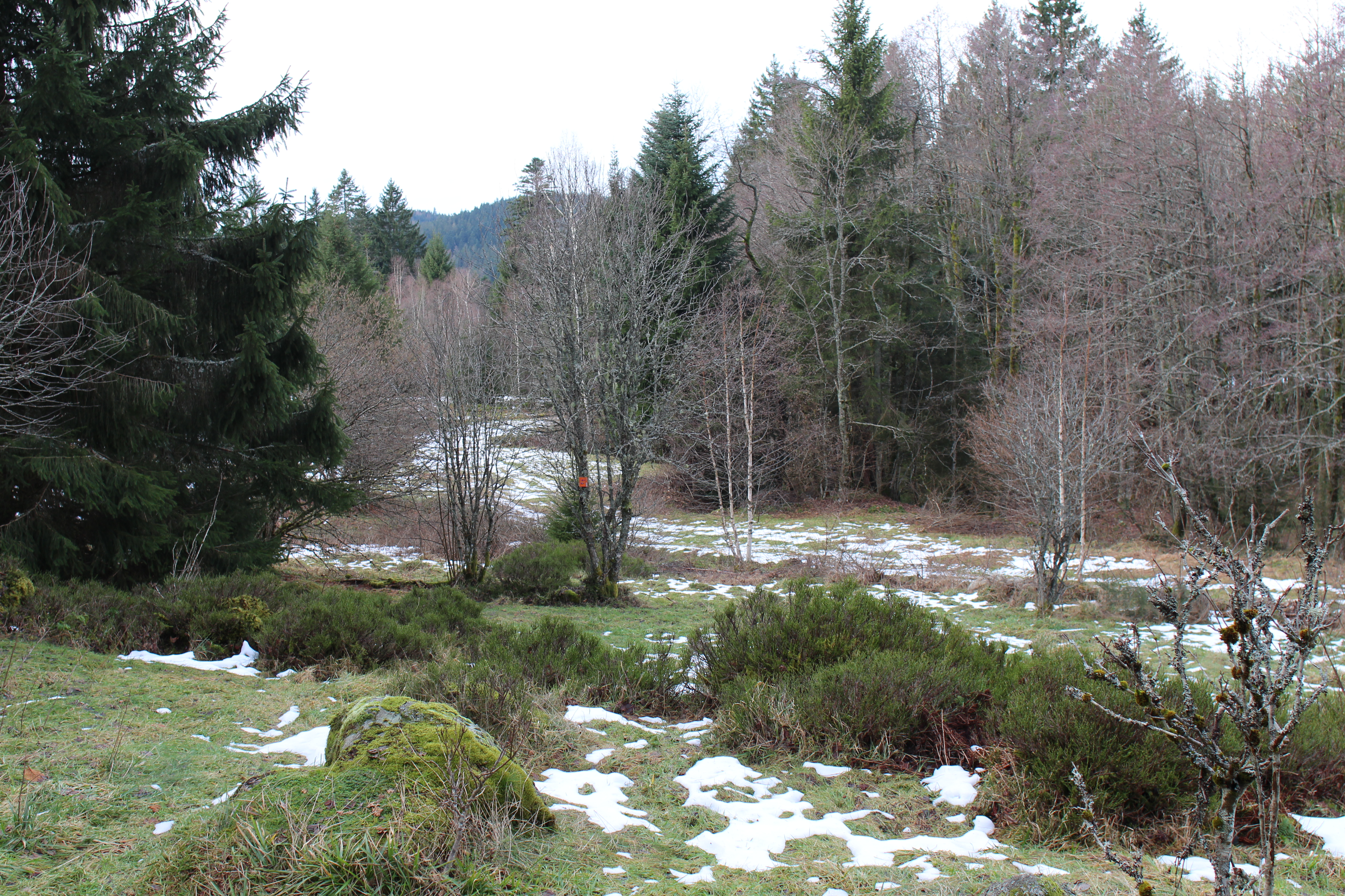 Turns out I forgot the new book with hikes in the area, so we have to rely on the newfangled internet. First we drive up to La Mauselaine, the ski slopes are closed but we’re hoping for an information center with some info about which hikes are closed due to snow. The info center is closed as well, but looking around at the melting patches of soggy snow, we don’t think we should be too worried about anyway. A local tells us that most of the snow was swept away by a storm yesterday, so while the high slopes might still have a few tens of cm, the lower areas seem to be mostly snow-free. We decide to just go for it and set off to the cross country skiing center of Bas-Rupt, which should have several trails suitable for snow shoes as well as hikers. Everything is closed here as well and the parking lot is empty, but we have a map and a smart phone with GPS, so we feel confident we’ll make it back, even if nobody is seems to be out and about. We decide to follow the aptly named La Deux trail (Trail Two), should be about 3 km.