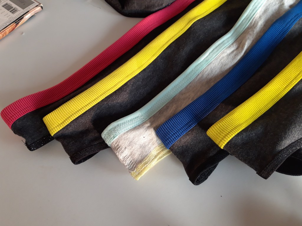 This is where it gets a little complicated. We use a normal sewing machine to temporarily fix the elastic to the waist, but also a 5 thread coverstitch machine to do the seams and hems. The coverstitch looks nice, keeps the fabric from fraying and most importantly: it makes an elastic seam.