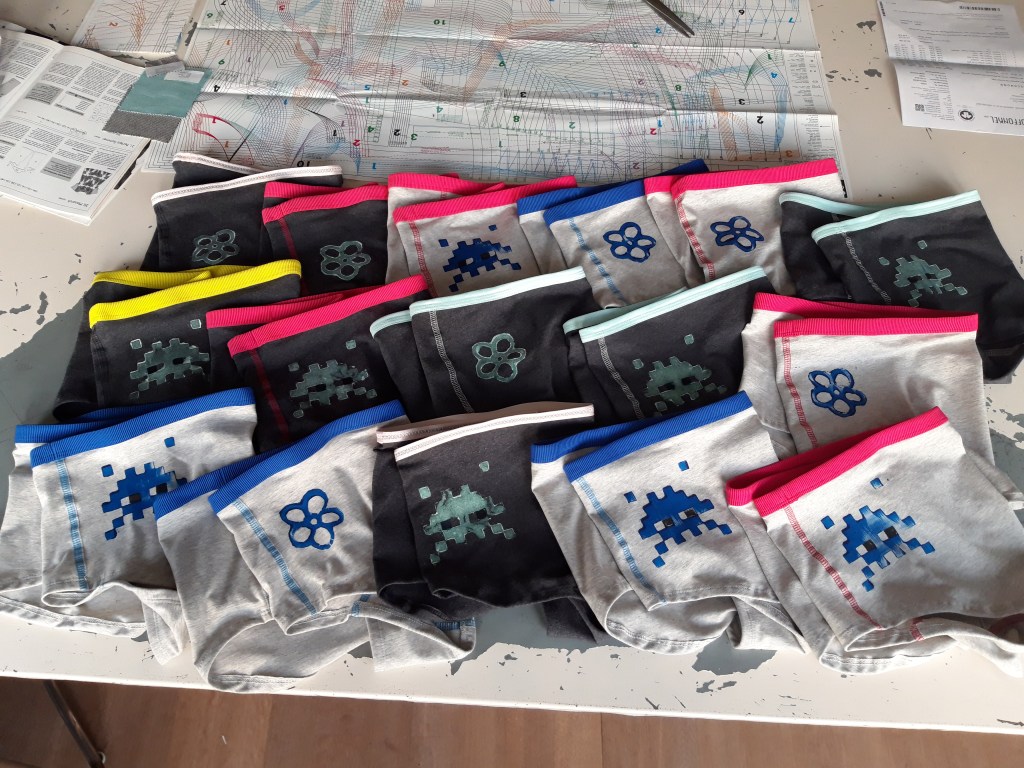 After a year or so we had perfected both the design and the production processes and now we have production sessions every year or so: not only for myself, but also other women in our circle. We’ve also added different embellishments, like stamped designs (including a deliciously ironic space invader) or 5 thread seams with five different colors of thread. We’re now considering to sell the mini-shorts and strings on my mom’s webshop.