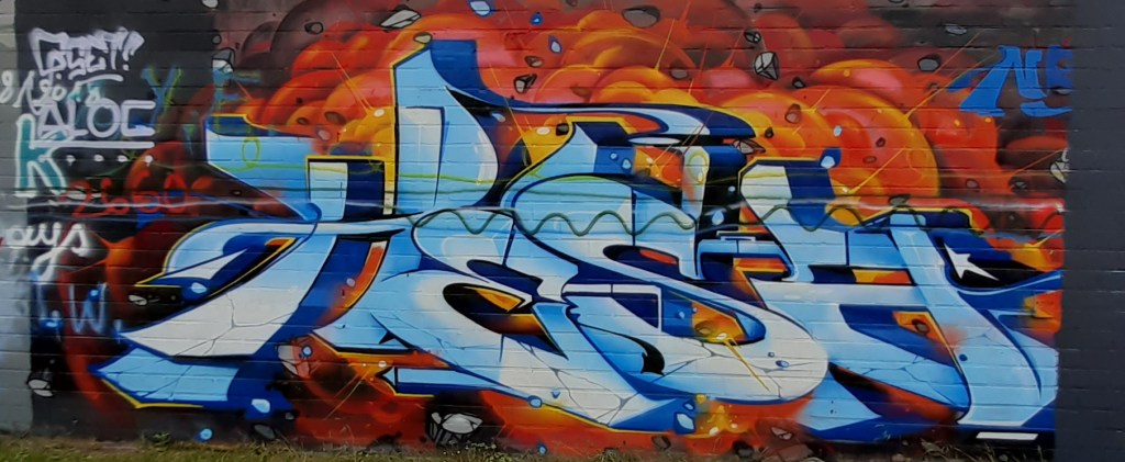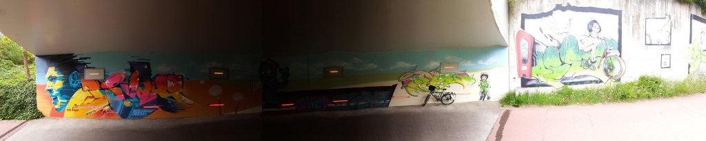 I can tell you it was light around 5h30 this morning since I was already awake, it was still really sunny at 7 but sadly it’s clouding over when I prepare to leave the house at 8h30. I have a wind jacket on and a rain jacket in my pack, as well as water, nuts for snacking and a kilo of Callebaut chocolate powder that I bought for my sister. Corona restrictions mean that I can’t see her, however my mom is in my ‘sport bubble’ and she is in my mom’s ‘social bubble’ so – if you’re still with me – my mom is the courier and we will drag around that kilogram the whole morning even if it kills us. Fortunately the wind is not extremely bad today (about 4 BFT) and I’m not too heavily loaded. Since the goal of the trip is to discover and photograph street art I have the big Canon Eos 700D and a wide angle 24 mm f/2.8 lens, as well as the 200 mm f/2.8 just in case we can’t get close. In those spots where you are too close to the graffiti – like in some bike tunnels I know – I’ll use the fish eye of my Samsung smart phone.