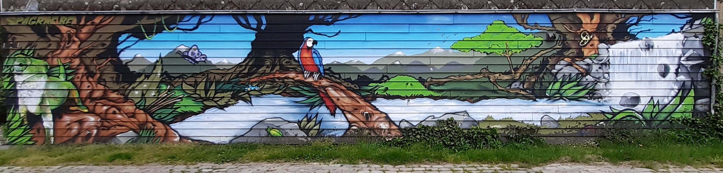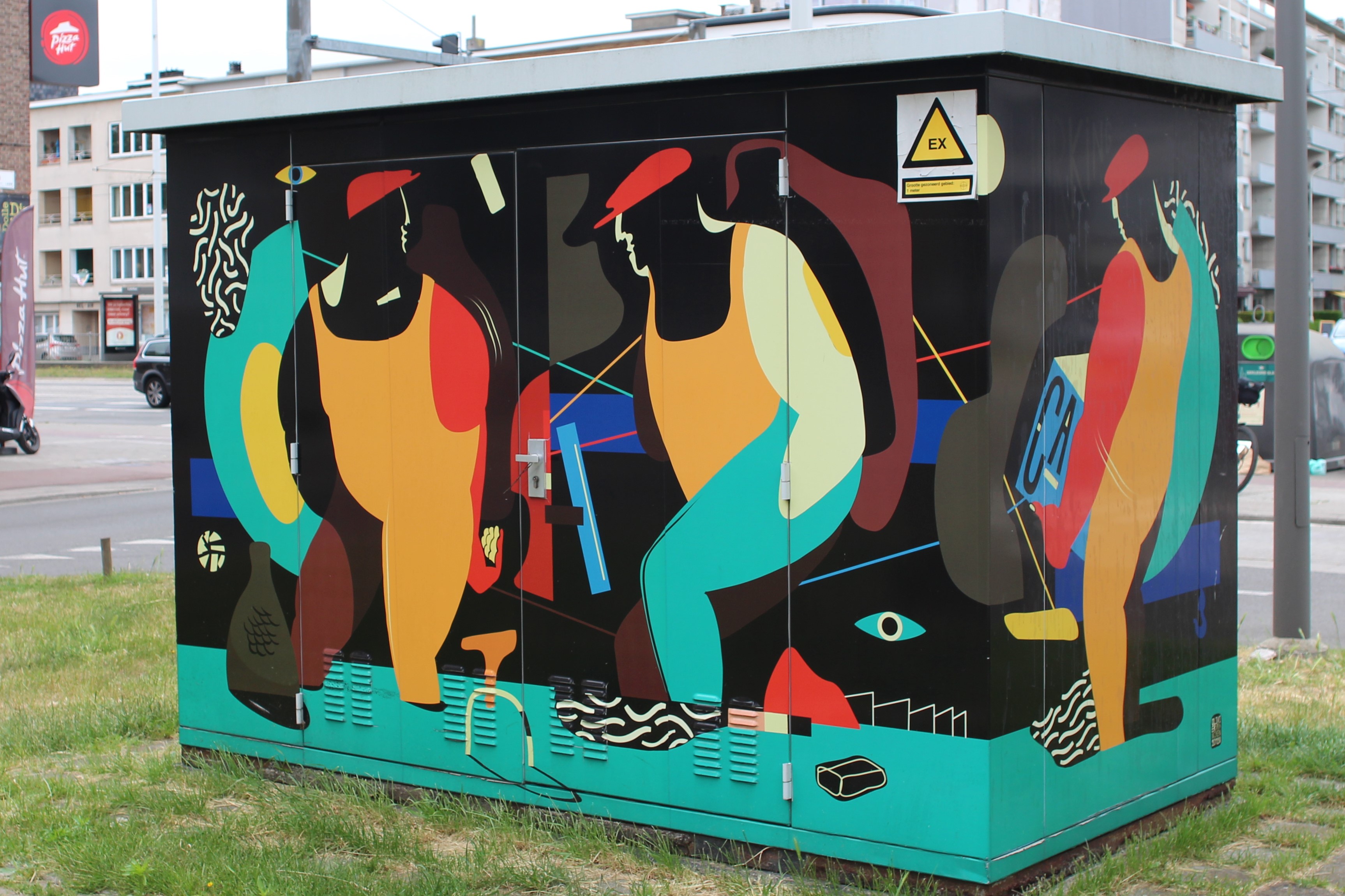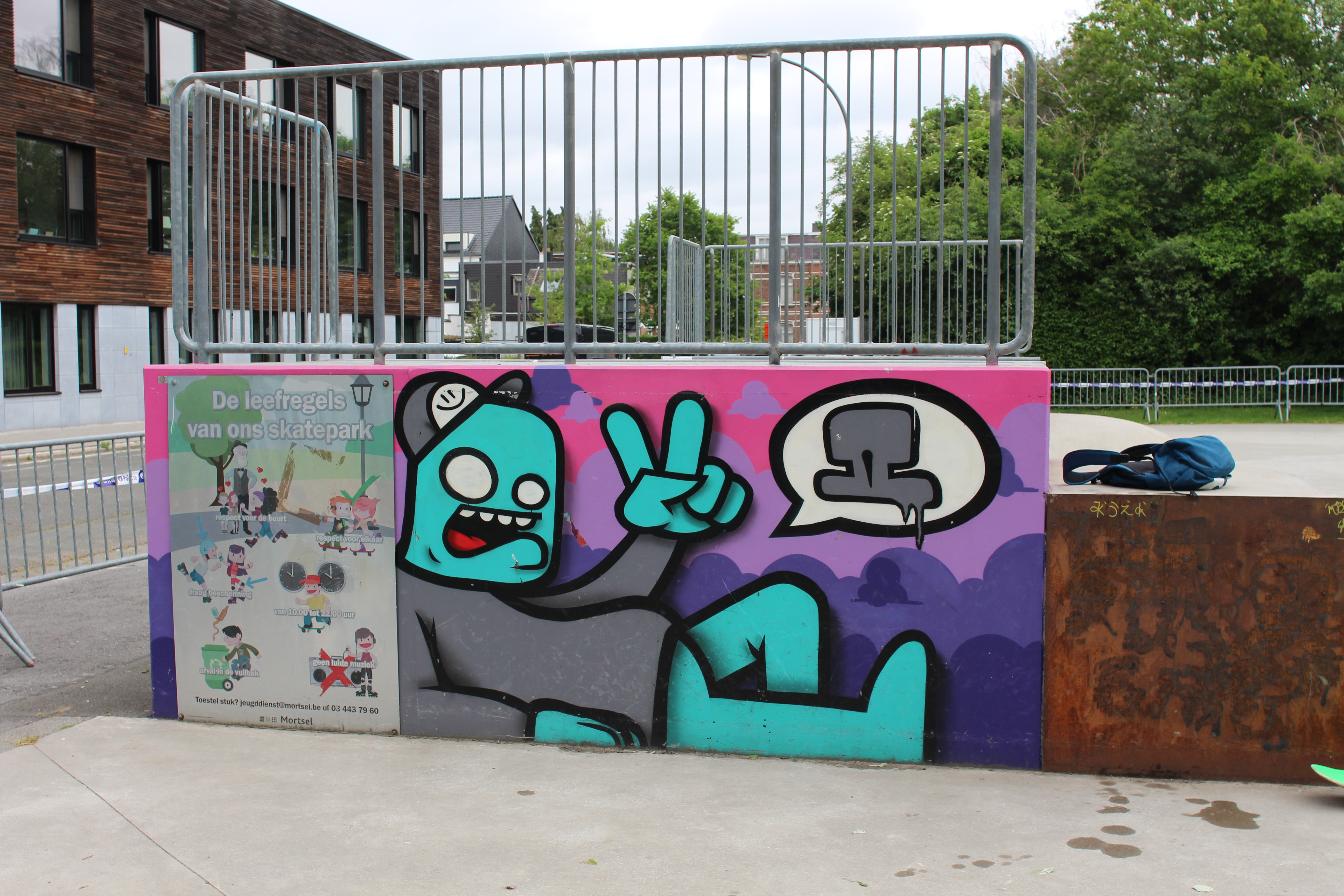 Almost back to the start, just a few more, smaller works to go. First up: Sweet Pumpkin Pie Love by Toy Factory (Sam De Buysscher). This is painted on a small utility block, about the size of a van. You obviously have a lot of these around town and they’re often painted or decorated like this. Next to a parking lot a kilometer south on the same street we find In the Jungle and on a skate ramp further on we find work by 2Dirty, you’ll recognize his style from the Depannage 2000 wall. We try to find two more near by, but they’re definitely not where they’re supposed to be according to the Street Art Cities app. No problem, I’ve already started up a mail conversation with the team and will give them my updates.