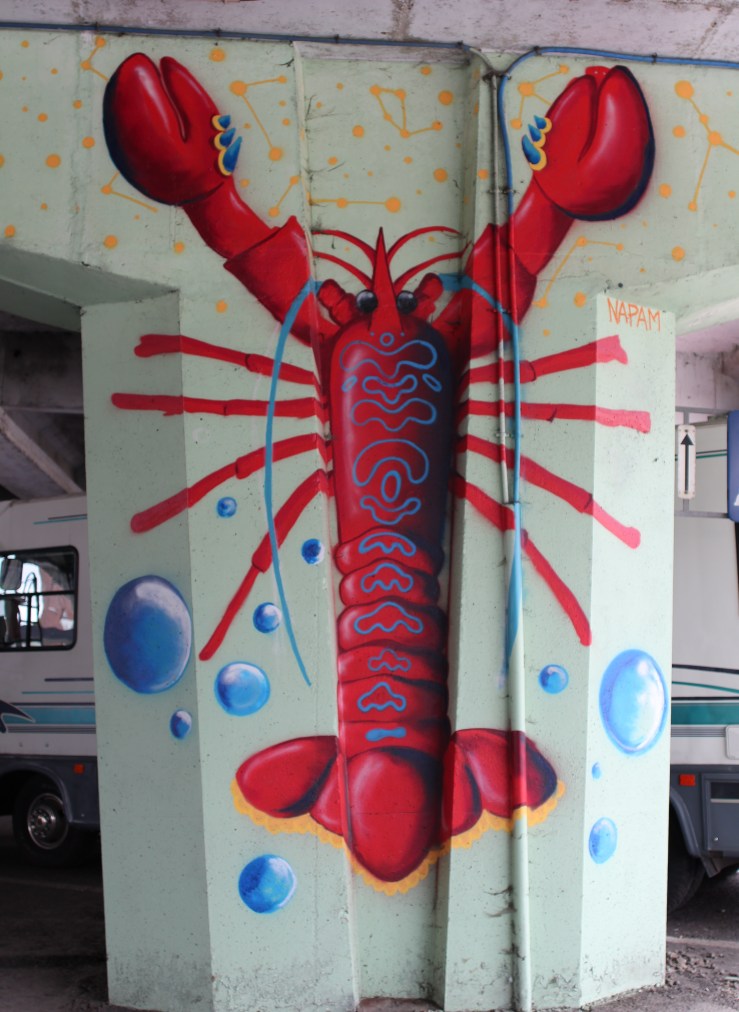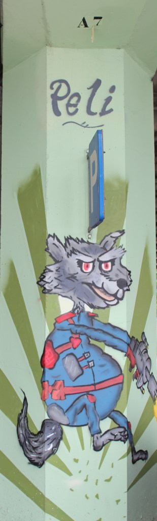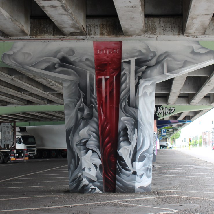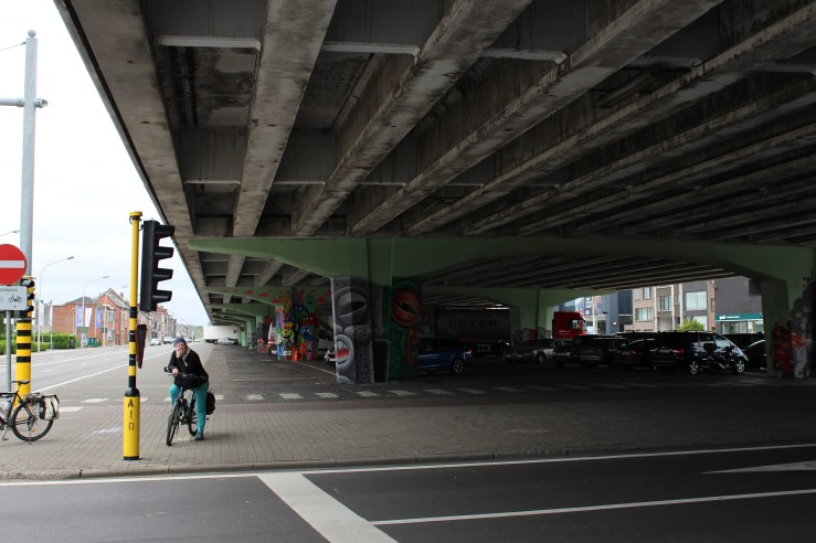 Onwards to Wilrijk, the next suburb westward. I already know this area a little and made an effort to a short nature trail to our loop, following a narrow green zone along a small brook. There’s a few joggers out and we see people queueing when we pass bakeries, but aside from that it’s pretty quiet. We arrive at the busy A12 route, this is a busy road with big stores on either side and when we come closer to Antwerp, the central road is raised on a huge concrete bridge, allowing cross roads underneath and a lot of parking spaces, now mainly filled with waiting trailers and sleeping garbage trucks. This was the site of a street art festival PillaAr 12 in 2018, pillaar referring to the concrete pillars holding up the bridge. I’ve seen a lot of these already driving by in the car or walking from a parking spot underneath the bridge to one of the shops, but now we’re zigzagging from one pillar to the next, admiring and photographing the creative art.