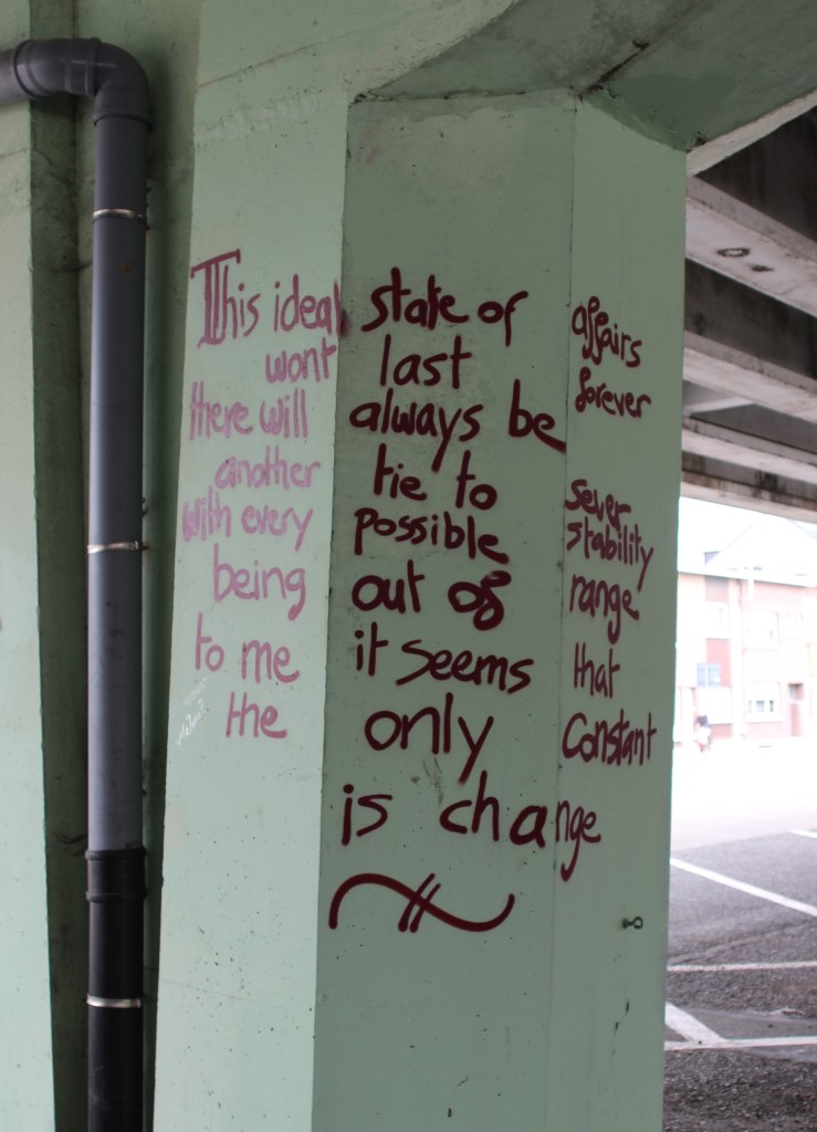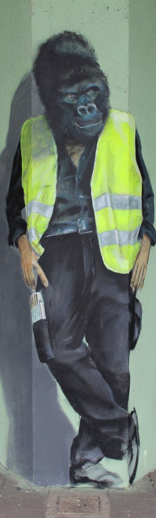 We’re about half way if you count the kilometers, but more than half way if you count the hours, as the A12 and Depannage 2000 areas are the only ones with such a multitude of things to see. We ride through the Kiel neighbourhood, back to the start of the A12 road, looking for It’s all in a state of flux by Timmy Lazr. We drive through a neighbourhood of row houses and find it on the wall of a basketball court. The gentlemen playing are of mixed heritage, between 30 and 50. They don’t want to be in the picture, but don’t mind in the least pausing their game for a minute to allow me to take the perfect picture.