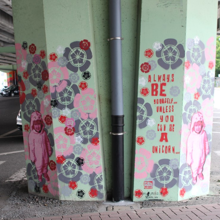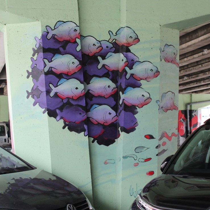 When I try later at home to find more info about what this mural is about, I can online find a subtitle: We’re all sinners, but honestly that’s how we build a bridge between progress and happiness (2015).