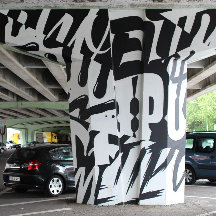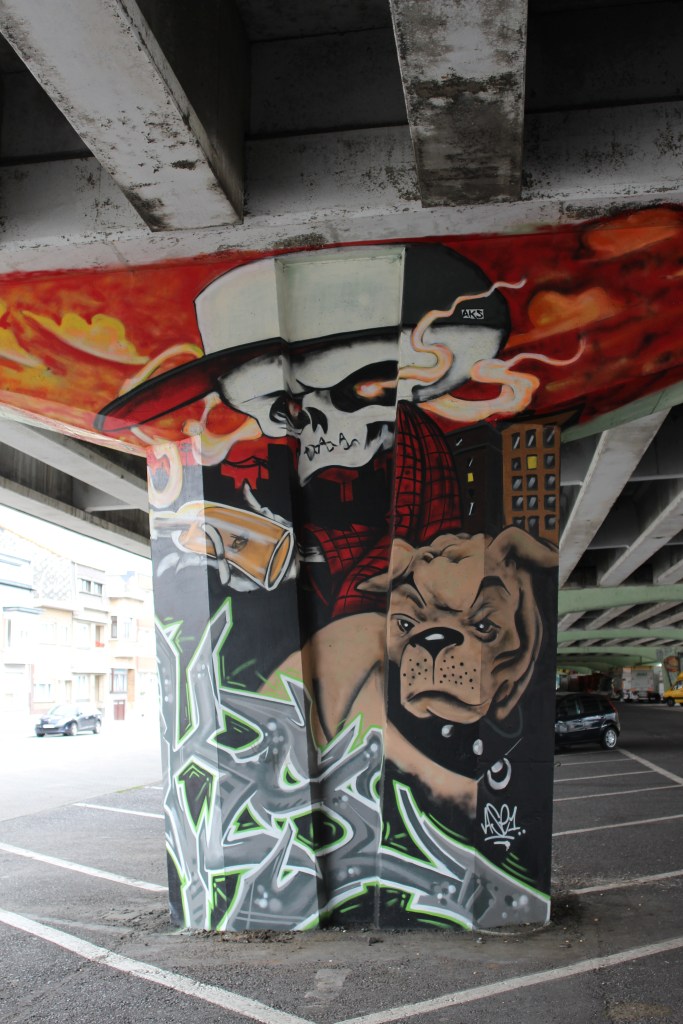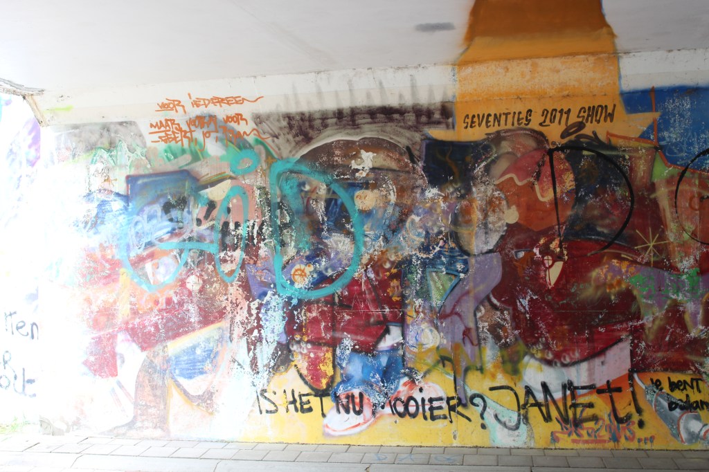 I wave goodbye to my mom at the Mortsel city square and do the last bit back home on my own. I’m kind of addicted now so I make two more stops for tunnel graffiti. First the official looking, railroad themed murals near Hove station and next the tags in a short bike path tunnel. You’ll recognize the work of 2Dirty again in both tunnels.