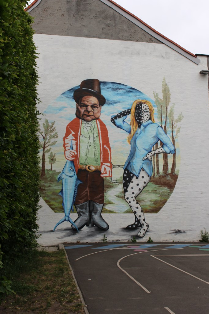 That was a bit more preparation than usual, but finally we’re off. Mom’s experimenting with her Garmin GPS machine and the thing now needs longer than I do to determine the direction, but we start of from the fietsostrade F1 and make our way west into Edegem. This is the hometown of Smok (smok.im) and we weave our way through the village searching for the pieces that are visible from the street. Even though they’re huge, they’re not always easy to spot, since they often occupy blind, out-of -the-way walls. We ask a lady with a pram if she knows where ‘der mag zoveel ni’ (that’s the old lady in the picture below, looking angry and saying ‘there’s so much that’s not allowed’) is located and she walks us right to it, meanwhile explaining that the artist will soon make an old man equivalent on her garage wall close by.