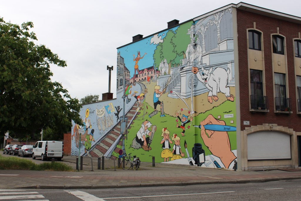 A bit further we arrive at a mural with comic book characters: Jommeke and his friends were drawn here in 2017 by Art Mural. The goats refer to the locals who apparently are historically known as goatheads. We continue through residential neighbourhoods – houses getting bigger and bigger – towards the university hospital Middelheim, where we ride all over area but do not find the moral. Somebody working for the university tells us it’s probably on the other campus Drie Eiken, I’ll have to inform the Street Art Cities guys. They’re apparently from Antwerp and the whole thing (website, app, ..) got started here.