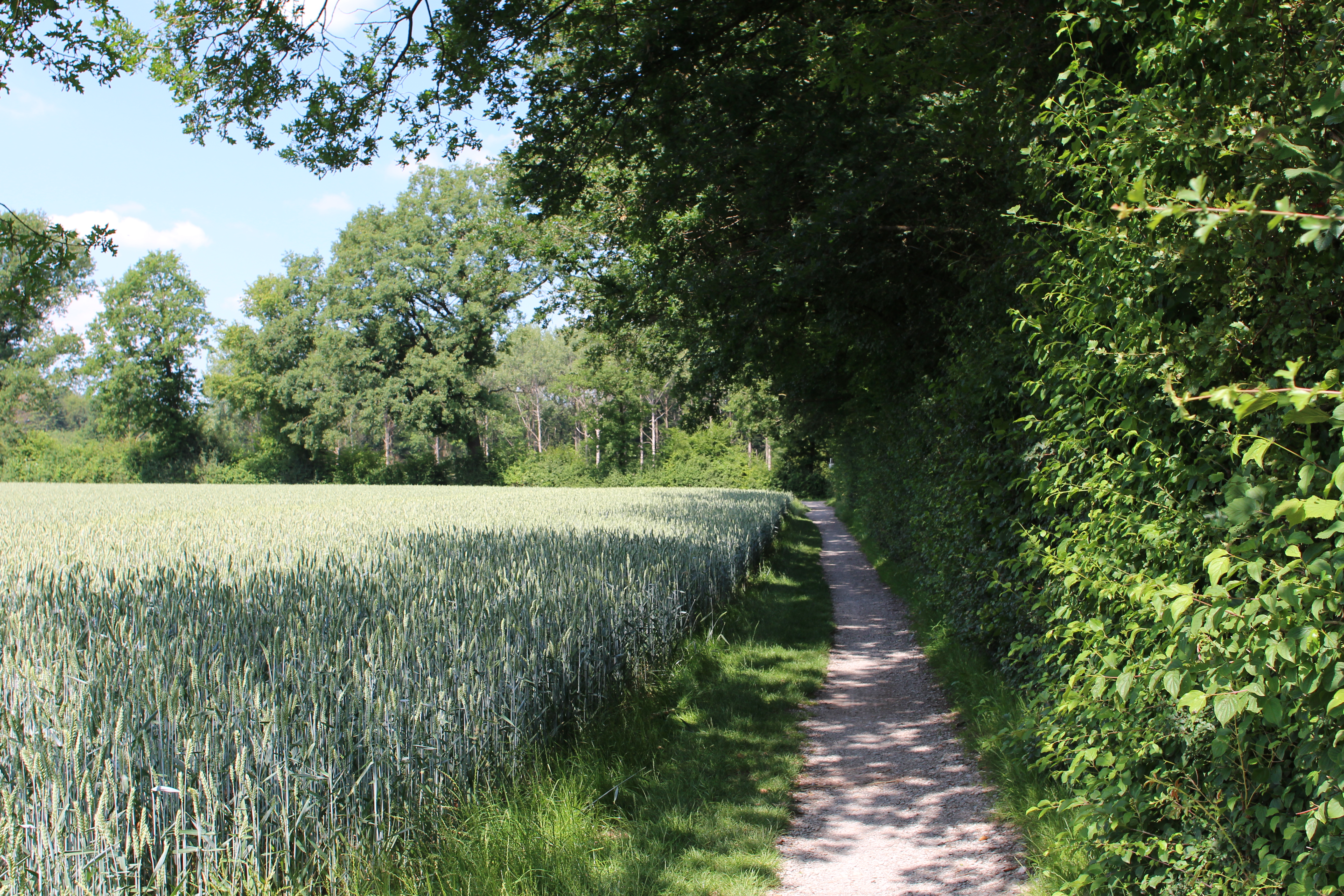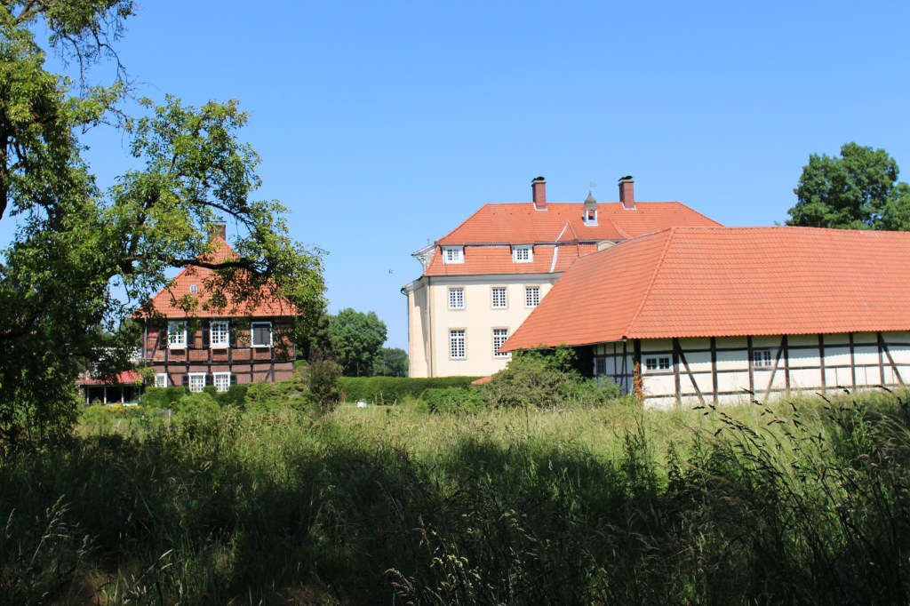 We encounter Haus Geist, Schloss Vornholz and Haus Diek, all in private hands. The hills here are not as high, but the landscape resembles a billowing sheet: continuously up and down, perhaps about 5%. Our average speed is quite a bit lower than yesterday, probably a combination of the hilliness and tiredness. We make it to Warendorf at the perfect moment to have an ice cream, though apparently everybody else has the same idea because it’s not easy to find a spot in the shade with a clear view towards the parked bikes. I have a summery bowl with strawberries, yum. Arne puts on his mask to visit the apothecary while I pay the bill – he needs shaving foam and we need extra sunscreen – and I do the same when he gets back: I need something for my giant bug bite. I swatted away a big thing from my forearm yesterday and it turns out it was quite venomous, since I now have a glowing red, swollen, credit card sized bump on my arm. Hopefully the cortisone cream will help a little, I put some on right away.