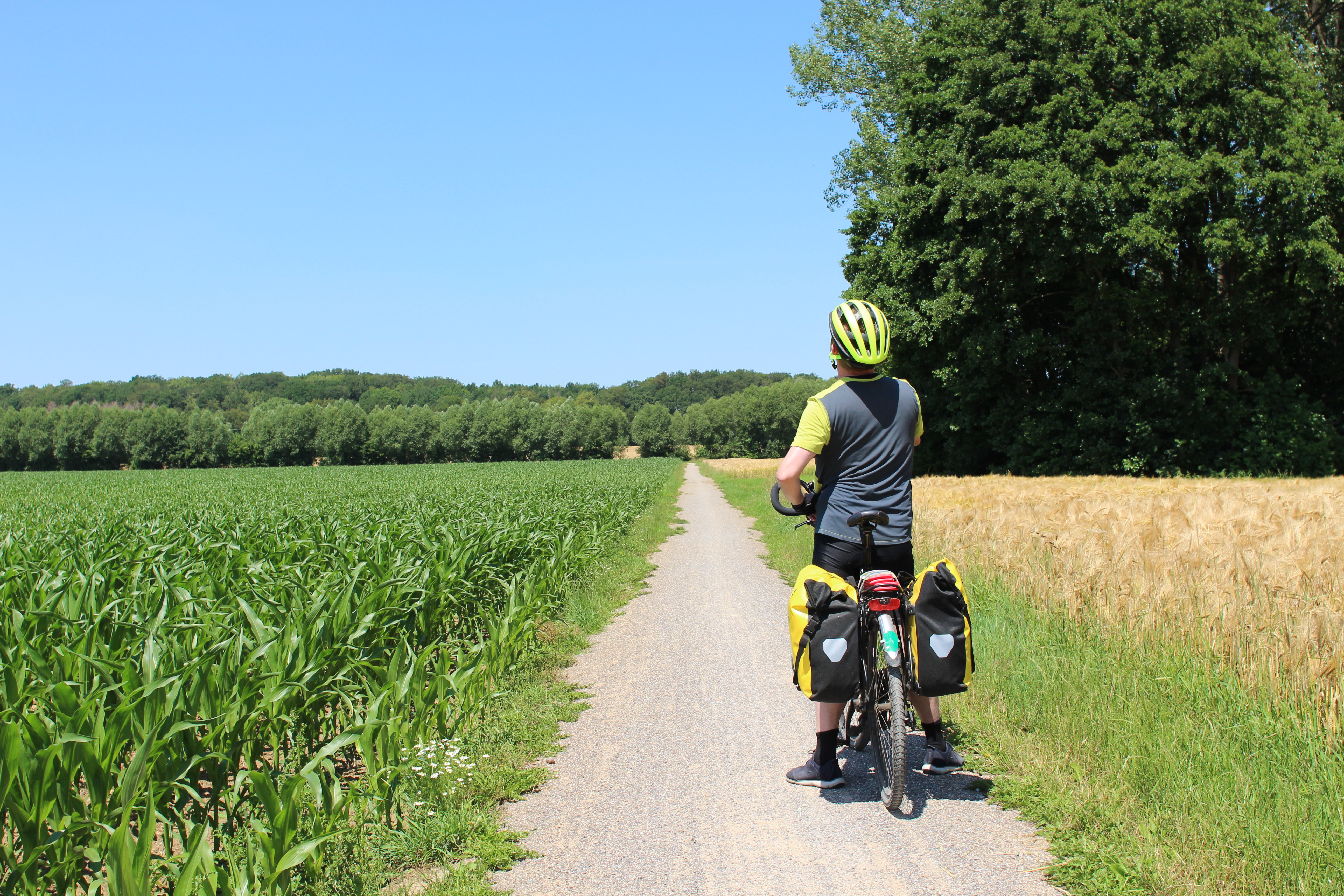 We’re up on the ridge now (we can tell because of the transmission tower) and it’s an easy ride along country roads to Stromberg. We take a quick look at the castle ruin and then start our descent towards Oelde. Whereas the climb was public road asphalt, now we follow narrow gravel or earthen tracks through the fields. This area is called the Münster park land because the many small agricultural fields are interspersed with forest and fields with wild flowers, indeed it’s a very pleasant landscape to cycle through. We come up to Oelde just in time for lunch, it’s a market day so we have to navigate the pedestrian area on foot and wear our mouth masks. As we stroll through the stalls, my mom calls to ask if we’re okay, apparently the area we’ve just left is now in lockdown. Nothing to worry about, we weren’t inside the lockdown area and anyway it’s not very strict, f.e. restaurants remain open. We have a grilled sandwich and continue through the fields and forests.