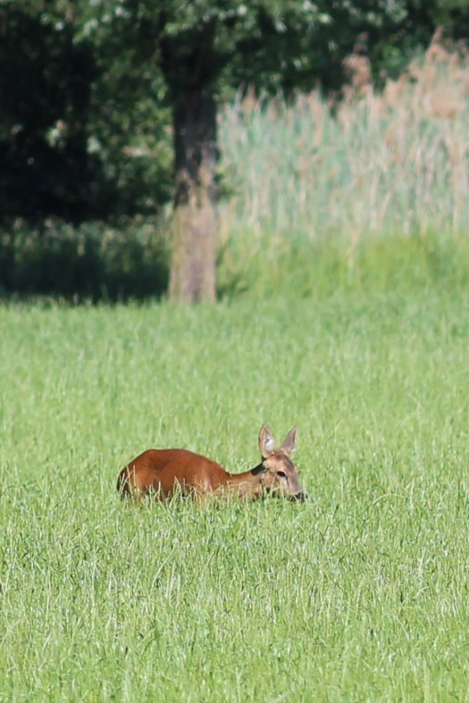 Only eight kilometers left to go, we follow the Ems briefly, Arne jokes that any moment now we’ll encounter the seniors of this morning and indeed five minutes later we see them coming from the other direction, so even though we think we took it very easy and they had the shorter route, we’re still quicker than the 70 year olds. We encounter an area where the river – straight and boring for the last kilometers – is being restored to a more natural course with meanders and shallows. Still pretty bare, but looks like a great project. A minute later Arne spots a deer in the neighboring fields, its legs are hidden by the grass but we can clearly see the body, head and big ears. I can take a few pictures before it hops away, we see two others further way, not that visible even in the bright green grass, see if you can spot them in the last picture below.