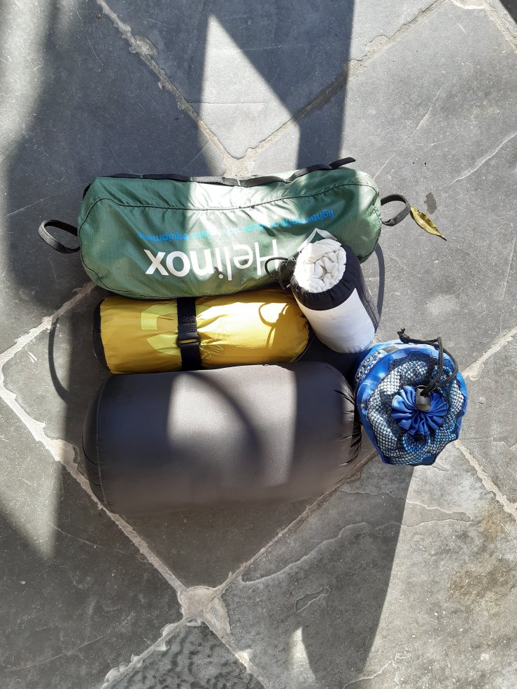 I still have my Dad’s bike from the trip to Pelt, I also borrowed his sleeping bag, Helinox camping chair and ultra light towel. Then I have my Mom’s back-up mat and linen sleeve. Honestly, when I go trekking by bike without all this stuff, I’m quite packed already, so I will have to drop some of my usual accessories in order to fit everything.