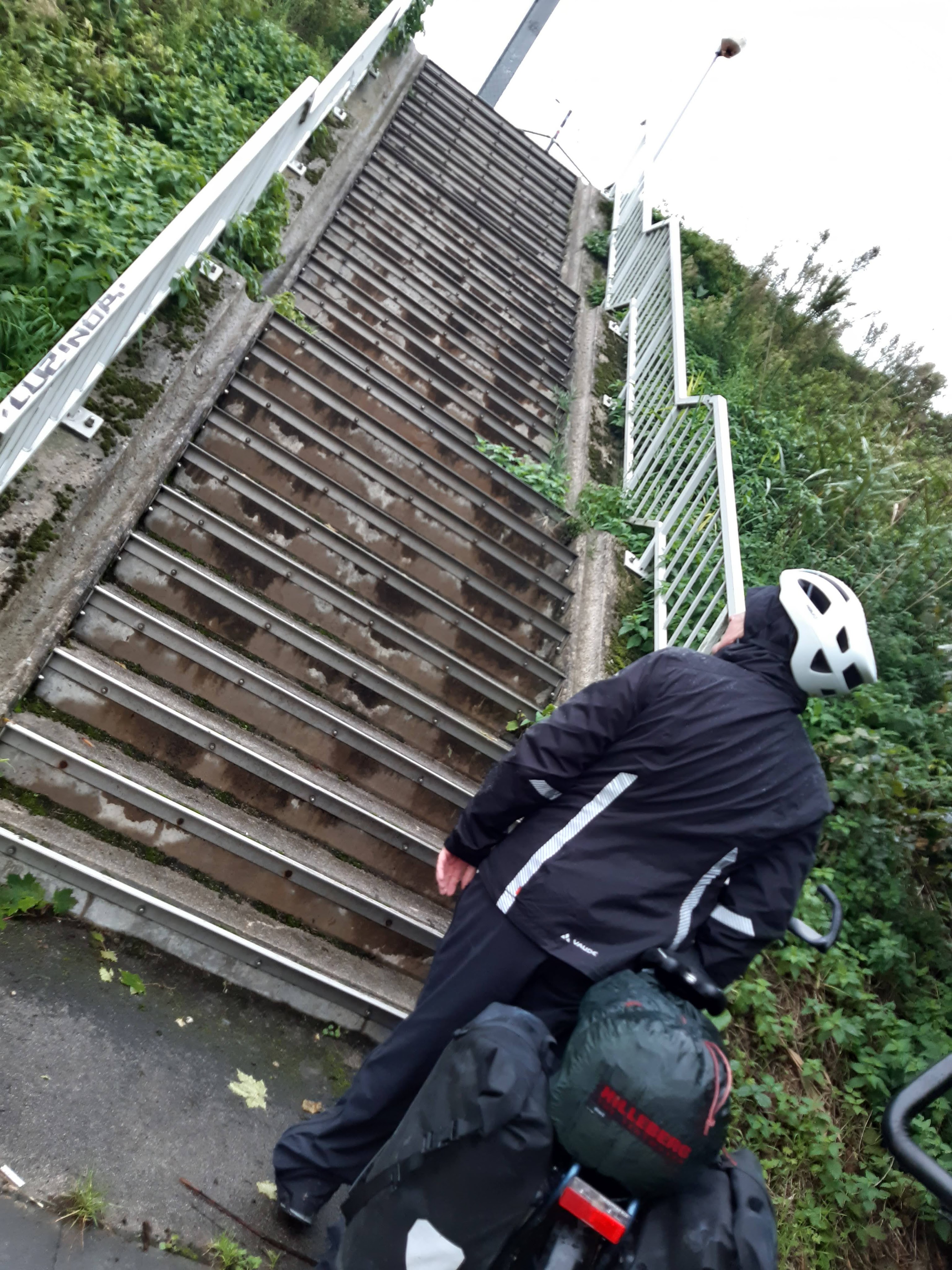 It starts raining while we pack and the weather radar looks bleak, so we set off again in Gore-Tex from neck to toes. My mom goes further and puts on the hood of her rain jacket, but I prefer a large billed cap to keep the rain of my face. I wear Gore-Tex shoes as well, but it turns out they’re ready for replacement, when we arrived yesterday the inside was pretty wet. Mom has a new pair since last week and her socks were perfectly dry, so I’m blaming it on age. After a quick clean of the hut and an inspection by the camping employees, we set off around eight thirty, in the rain. We follow the busy R4 periphery road along the Ringvaart canal until we reach a large railroad, which we want to follow all the way to the Schipdonk canal. First we need to climb the steep staircase to get from the canal to the railroad bridge, it takes two to push a loaded back up.