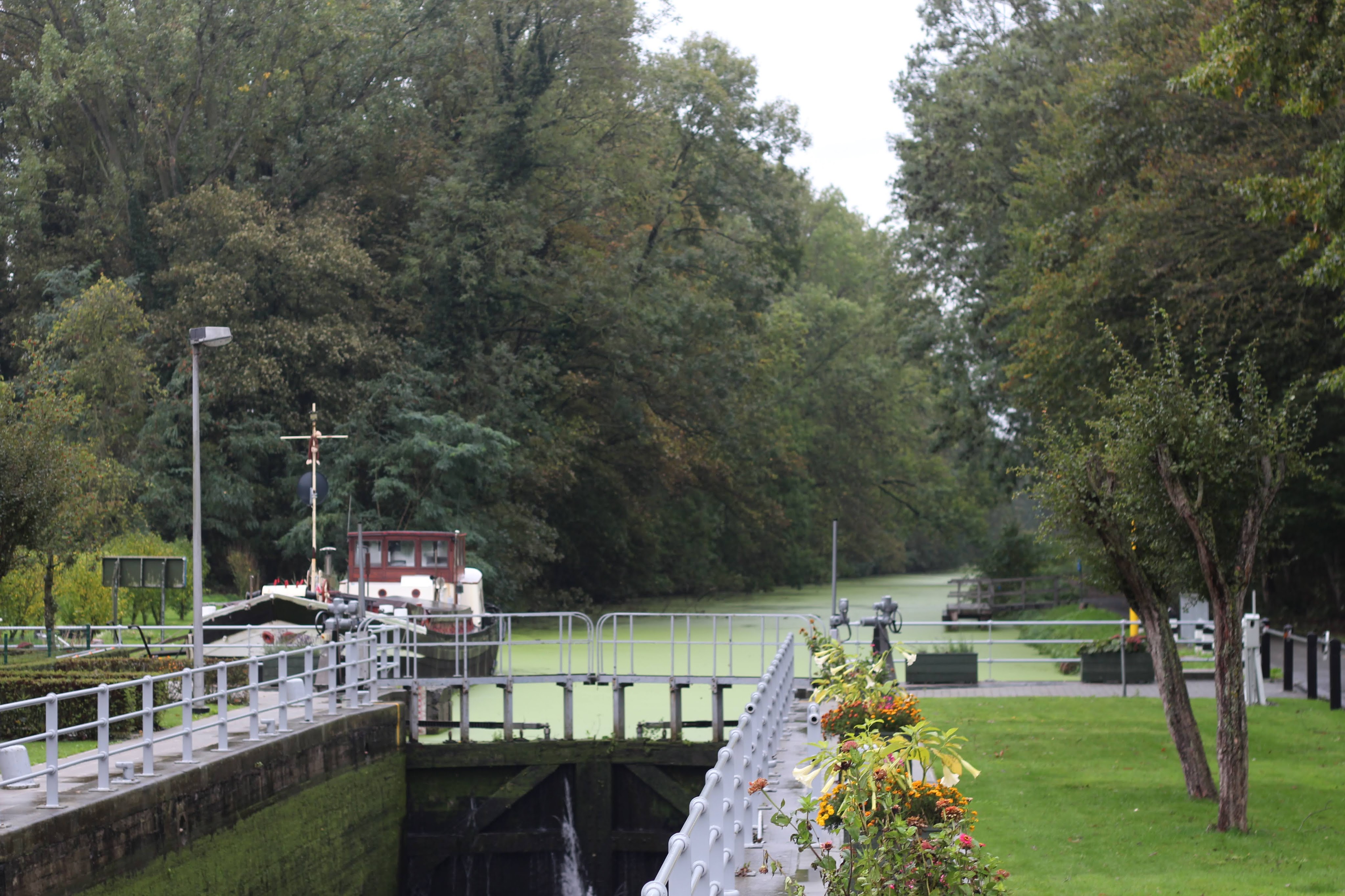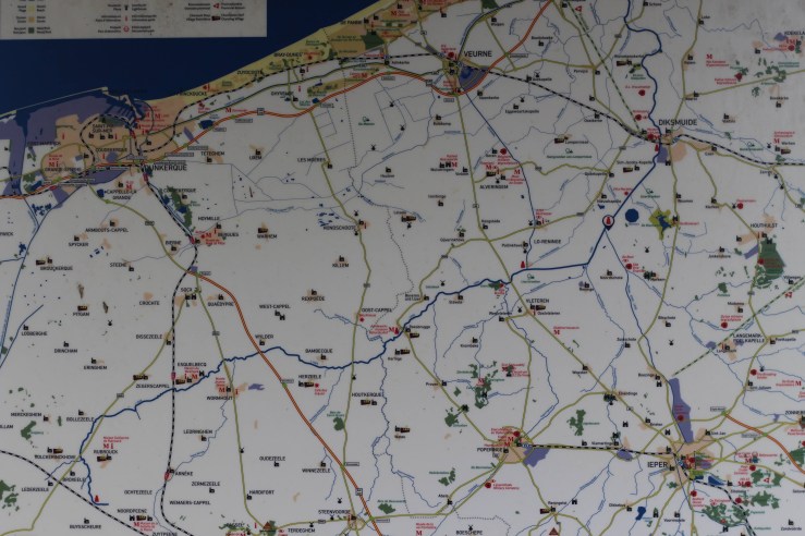 We stop and read the information panels at each of the points of interest: the memorial for the Van Raemdonck brothers, the locks at Boezinge – where the front line was located between ’15 and ’17 – .. It continues to rain slightly as we ride north, but I take off my rain pants anyway because I have the impression my knees were a bit less bothered yesterday when I didn’t wear them. It’s only a total of 40 km today, so I prefer wet knees over achy knees, though honestly they’re still pretty bad. We’re starting to think about alternatives, because it doesn’t feel like this ache is going to go away by itself and I’m thinking that continuing the activity that caused the ache in the first place is not a good idea.