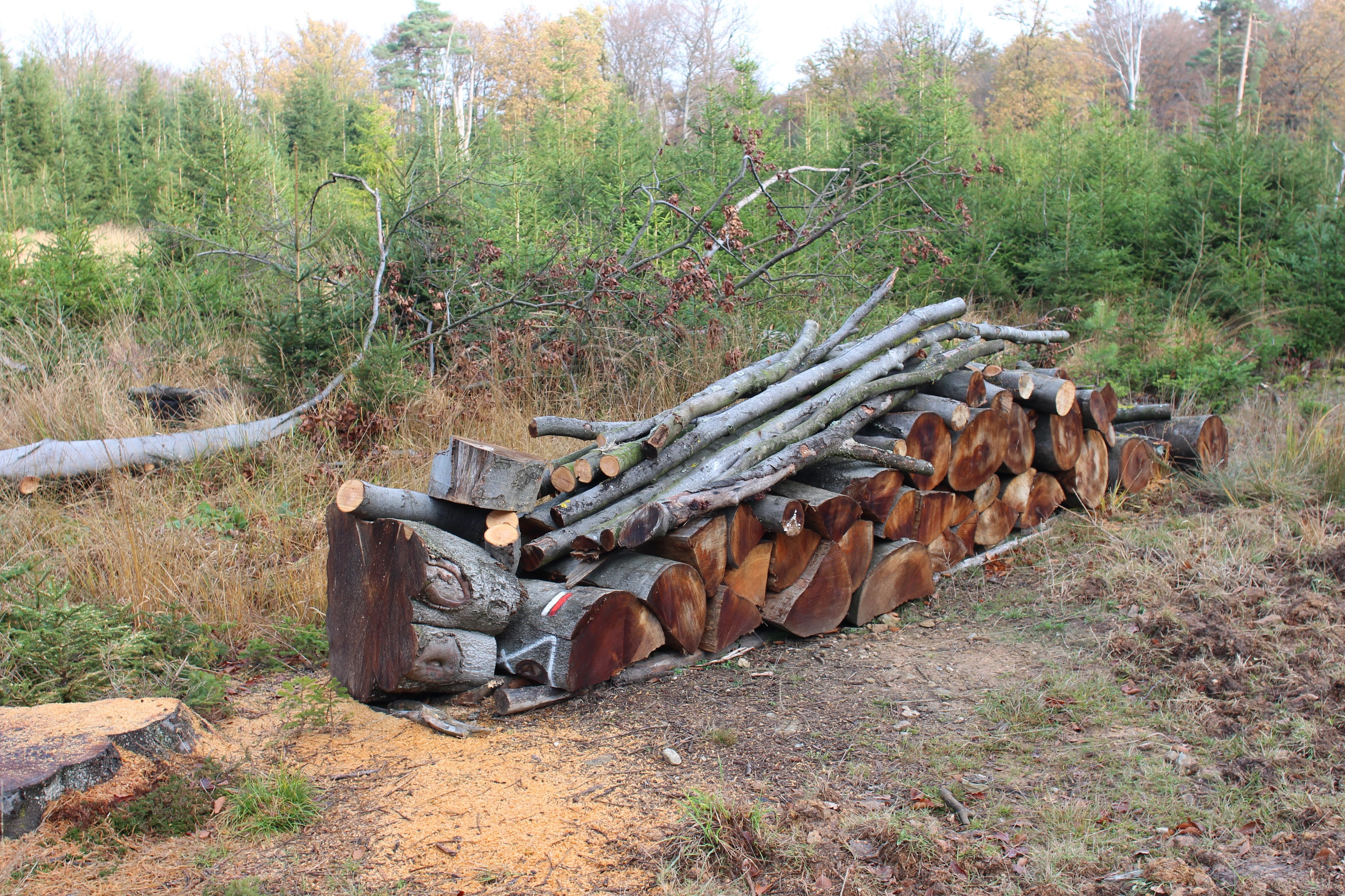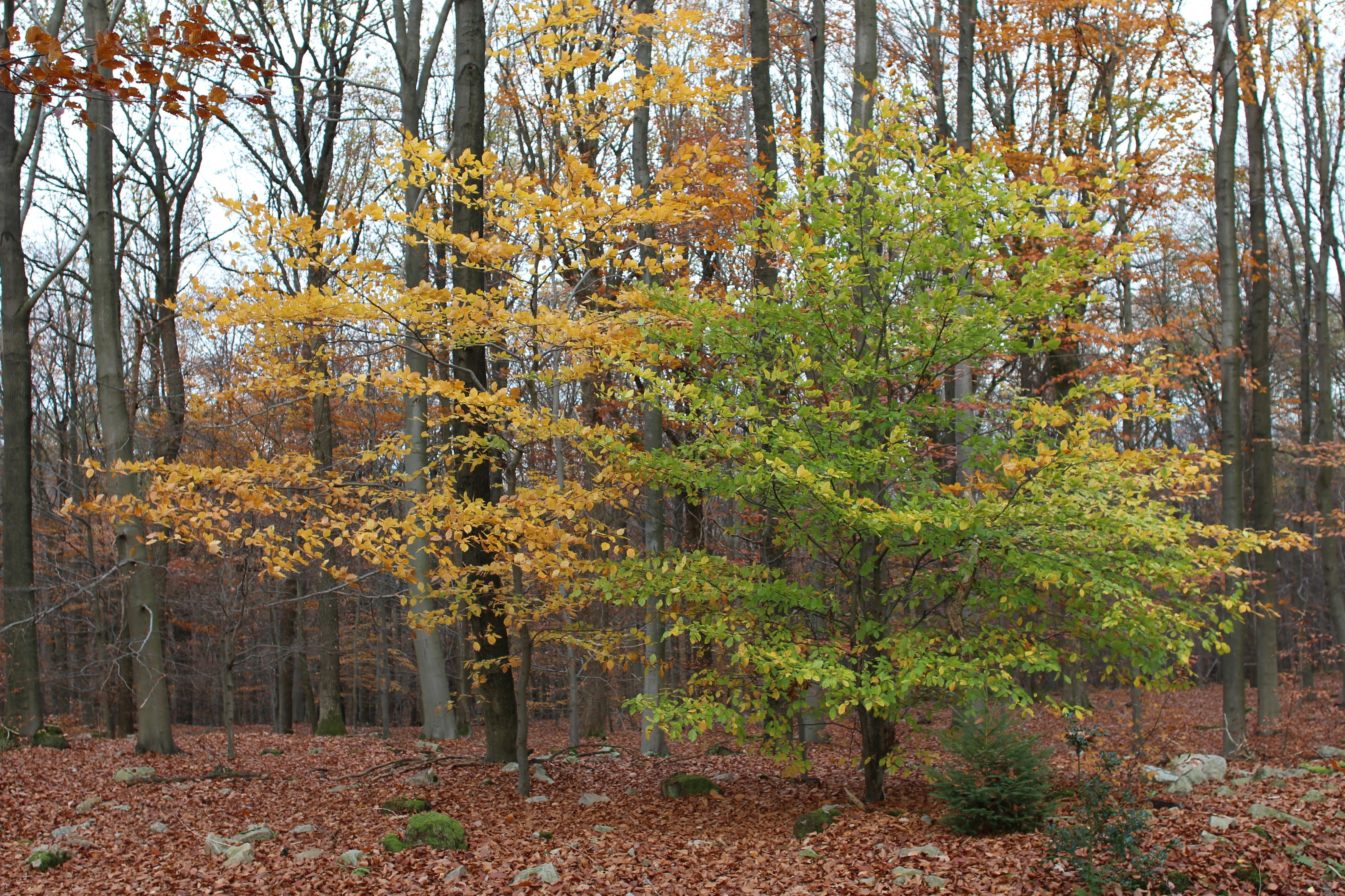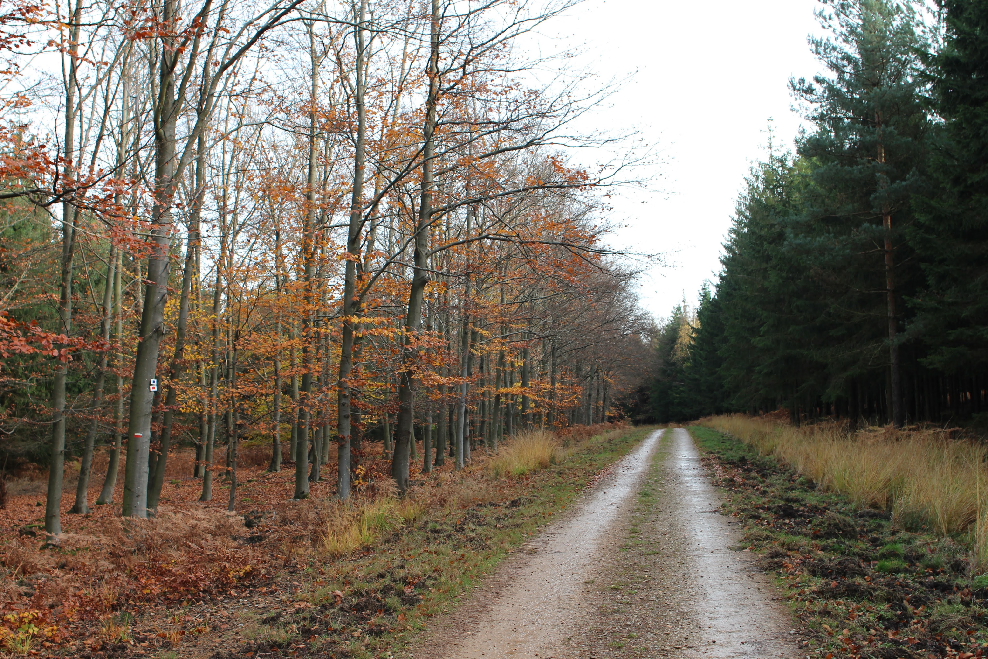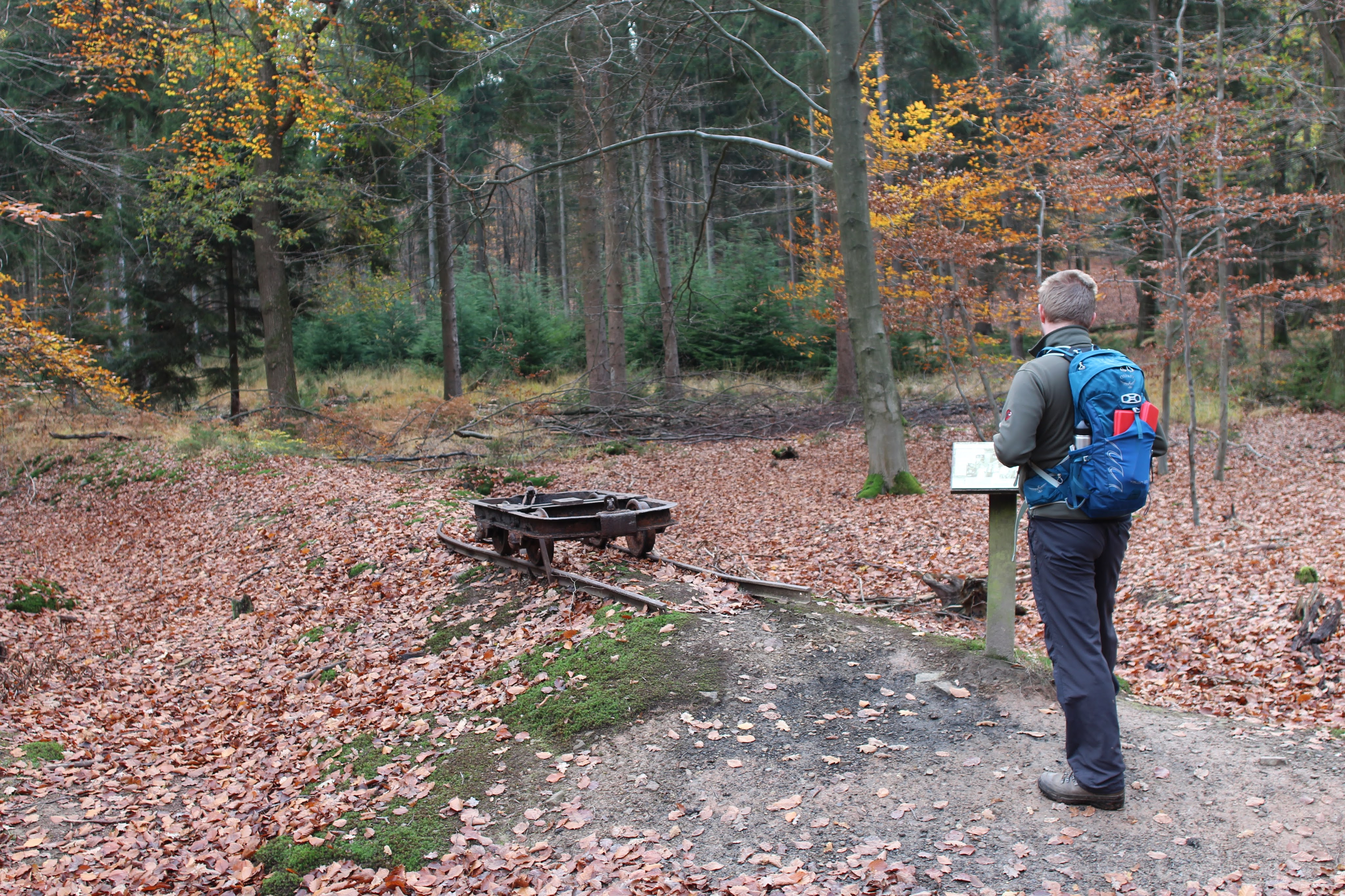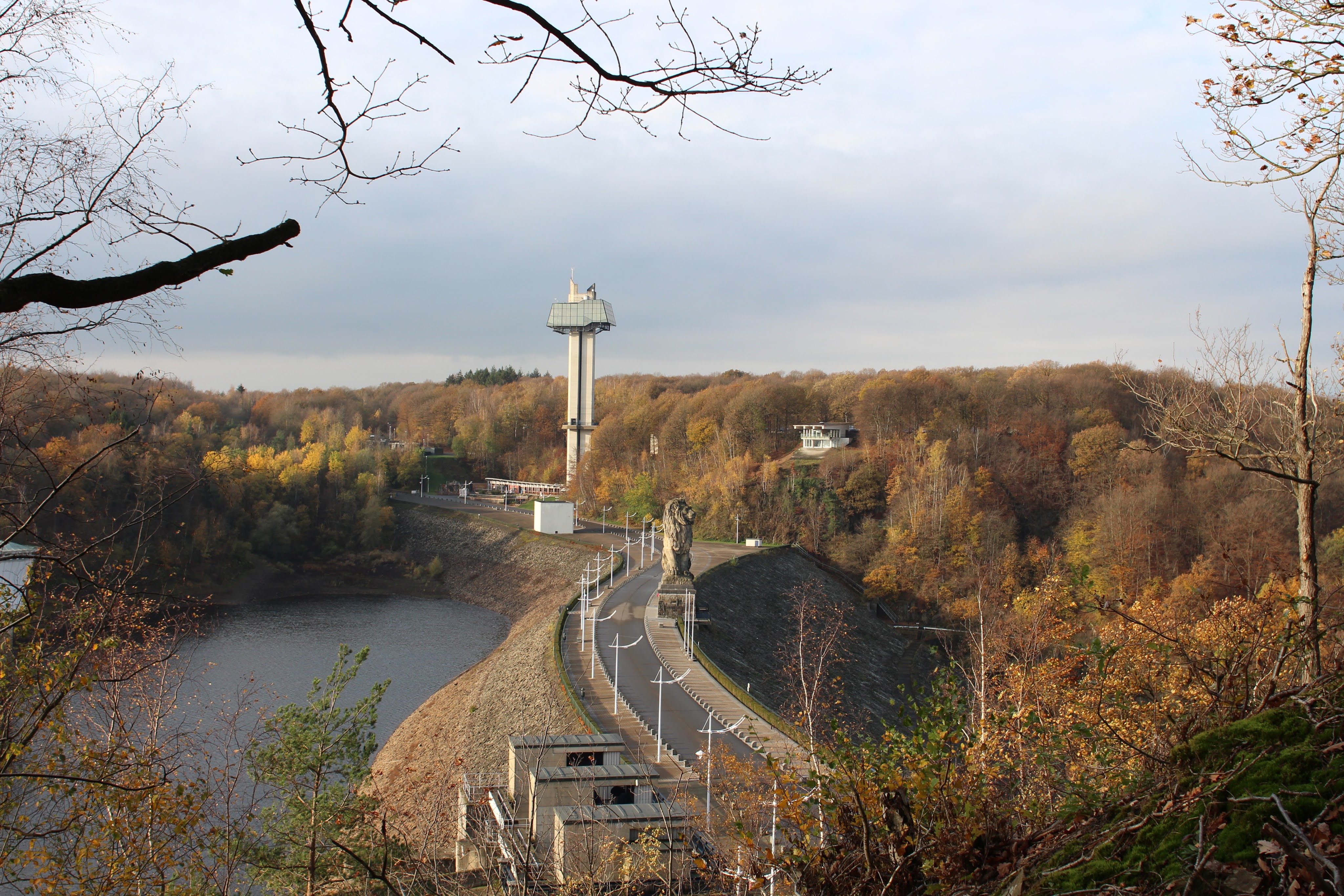 When we leave the car in the parking lot of the La Gileppe reservoir around nine thirty, there are a few other cars but it looks like we’re early enough to avoid the crowds that this lot was obviously built to expect. It’s not too cold and it’s supposed to stay dry, so I start the hike with three merino wool layers and a windstopper. I’m carrying my camera with the 24mm lens on the self-made harness and the rest of the camera gear in my backpack. Arne’s carrying a small pack with a thermos filled with hot tea, a few snacks and sundries. We follow the Wikiloc hike into the hills around the lake, wading through a deep carpet of crispy leaves. We encounter a few other walkers, also some mountain bikers, but in general it’s pretty quiet. We reminisce about previous travels, look out for wildlife – but fail to find it – and enjoy the color of the leaves in the sunshine. We sit down on one of the benches to share two Chimpanzee bars, I advise the one with dark chocolate and seasalt!