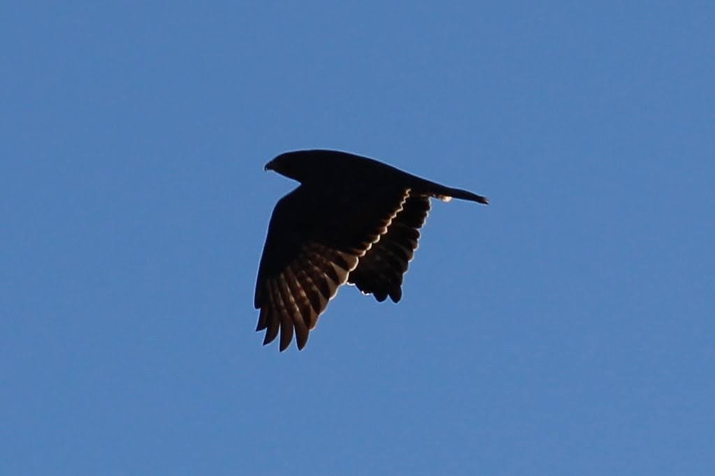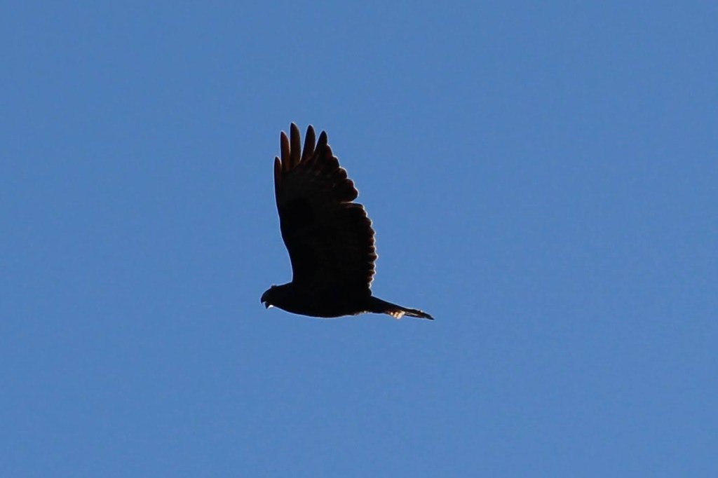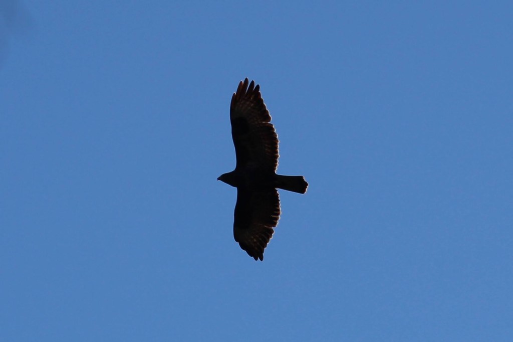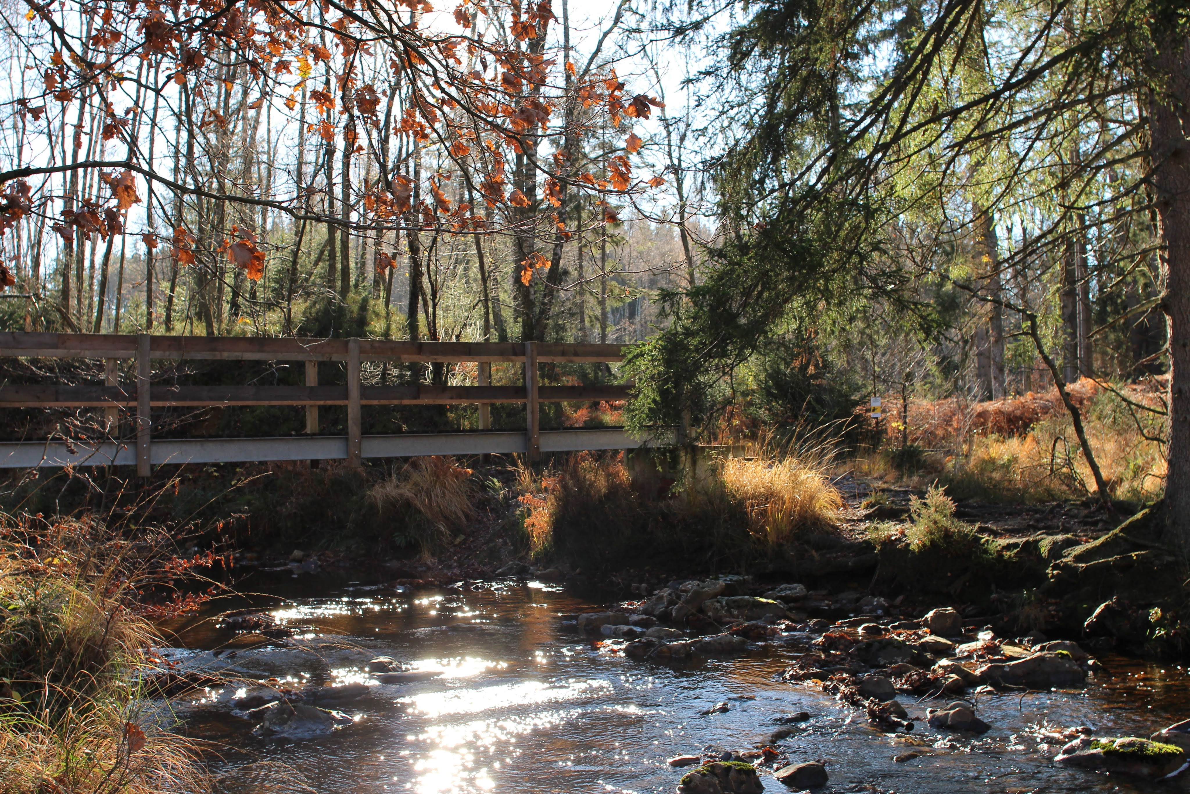 We continue more or less in the right direction, slugging through the mud, hopping over rivulets on stepping stones and checking now and then on the navigation app to see if we’re not deviating too much. We keep our eyes peeled for deer, boar or any wildlife really, but see nothing except a very few tiny birds. We take a break at the edge of the bog, I can almost feel the vitamin D production boosting up. A bit more hikers here, we must be back on the main track. This is the highest point of the tour, so as we start circling back to the car, we descend back into the humid valleys. There used to be a small settlement here until the 1960’s, when it was expropriated by the government for the safety of the Wesertal reservoir, as it’s used to produce drinking water. The settlement was so isolated that one winter they had to airdrop emergency supplies by helicopter, but now there’s only a few walls and a memorial chapel. Down we go, squelching through the mud. Arne sees a kingfisher flitting away, but I’m just to late and I miss it. I put the zoom lens on my camera while we take a break (another picnic bench, it’s amazing!), but it doesn’t return. I do manage to take a few nice pictures of a bird of prey further on, but still no luck with the larger mammals, though we stop frequently to gaze at the valley slopes.. The sun is low and the valleys are already in the shadow, though the tree tops remain beautifully lit, very picturesque.