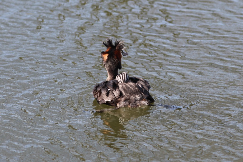 The canal here is wide and the water today looks very calm. We see only one boat, but water birds aplenty: a big blue heron, lots of common coots and great crested grebes. One of them has a tiny chick and we stop for some pictures. I attach the 200 mm lens to photograph them twice: one when the parent (you can’t tell if it’s a male or female) and chick are close by and once again when the chick climbs onto the hen’s back for safe transportation. I’ve switched back the lens to 24 mm for the second time when the its mate arrives with fish dangling from his beak. It has to work to keep a hold of it but finally manages to pass it on to his/her friend, who promptly swallows it whole. (N.B. I only notice in the evening, when I’m sorting the pictures on my laptop, that the babysitter had a second chick on their back the whole time).