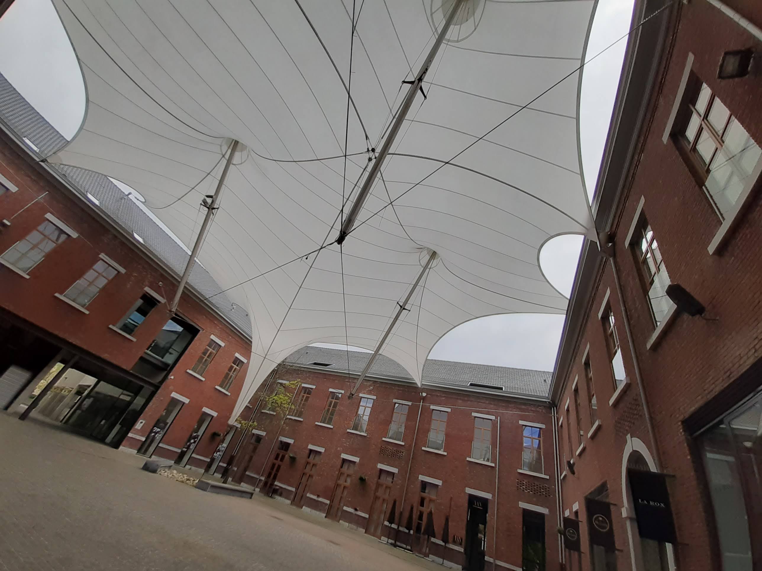 We also admire a really cool construction to shade a large courtyard: a shaped canvas is stretched taut over a steel construction over a 40 by 40 m space, without support pillars to the ground. The vertical pillars are themselves hung by wires from the walls, so that the whole thing seems to hover between cobbles and clouds, a marvel of engineering.