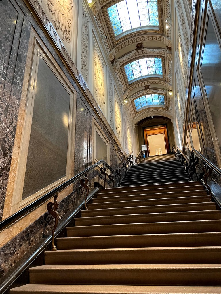 This is a lively neighborhood – lots of cyclists – with fewer tourists and pedestrian zones and there’s a lot of people having breakfast on terraces outside. It’s sunny but not yet very warm, so we decide to have our breakfast inside: I decide to go all the way and order eggs benedict and a chocolate milkshake, it’s delicious. We have loads of time and chat about whatever, mom has a second coffee and croissants for dessert.