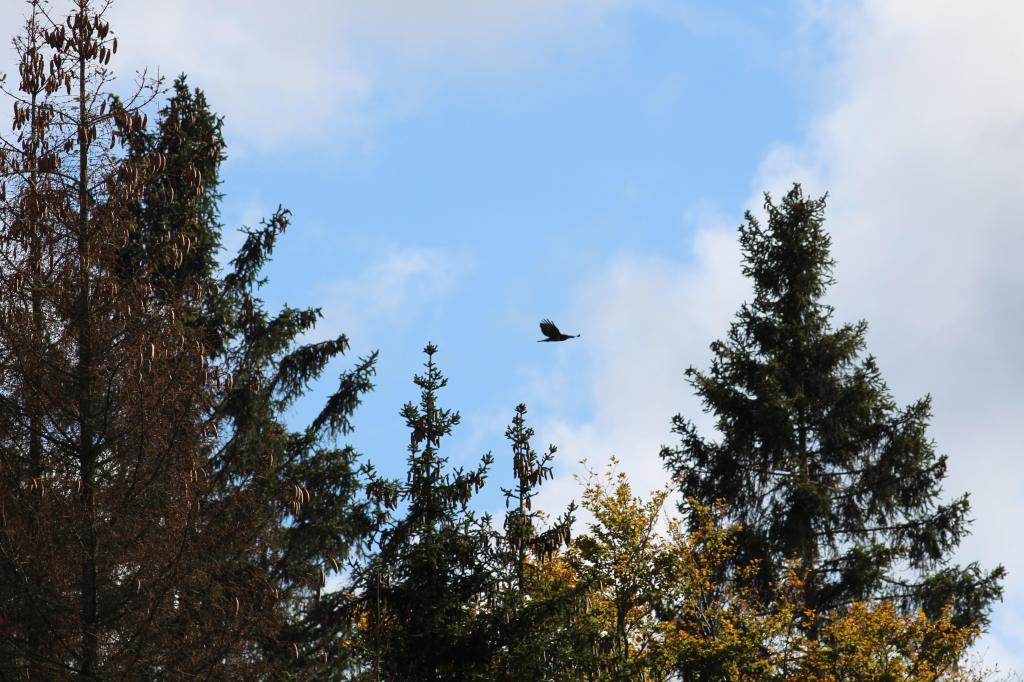 It’s a beautiful walk, we follow some smaller trails through newer forest (we can tell because it’s not dead spruces), crossing the occasional forest meadow and a few hillsides that used to have old spruces (we can tell because they’re all gone). The sun feels really warm but there’s a considerable wind chill now and then, I adapt by taking off/putting on my thick woolly hat. In the middle of nowhere, we encounter a hole in the ground, with a wooden fence around it and an info panel. This is a mineshaft from the 16th century! 16th! They dug for silver all over this mountain range, hence the often recurring references like Silberteig – Silver pond.