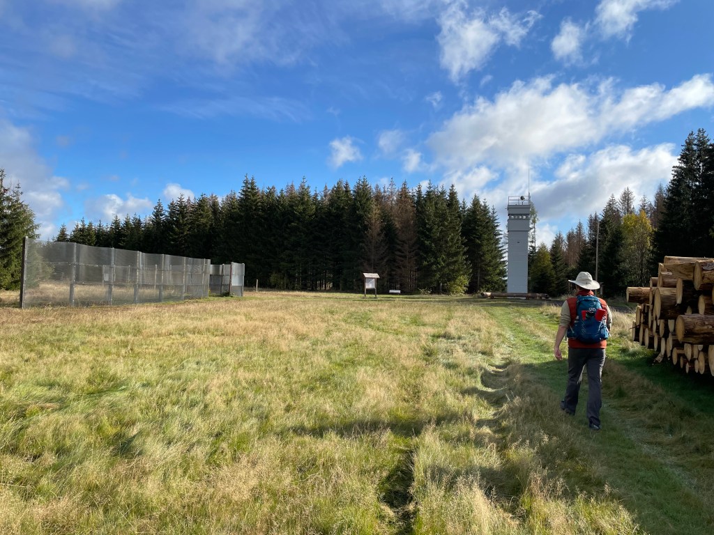 I fix the classic hiking lunch: a bread roll with salad greens, a slice of tomato, ham and cheese, seasoned with mayo and mustard. For myself, I add some young sprouts, I like the tartness they add. We pack up and leave, or at least try to and then return upstairs for my sweater and a change of hiking shoes for Arne. Finally, we’re off. We leave the tiny village of Hohegeiß and follow the Kolonnenweg – the old convoy road – in straight lines over the landscape. As in previous hikes, we see a lot of logging activity: a vehicle on caterpillar tracks depositing cut logs by the road, a truck with logs on its trailer and once in the distance the sound of a falling tree. When we encounter such activity right by the road, the operator stops the crane, even kills the engine, before waving us past.
