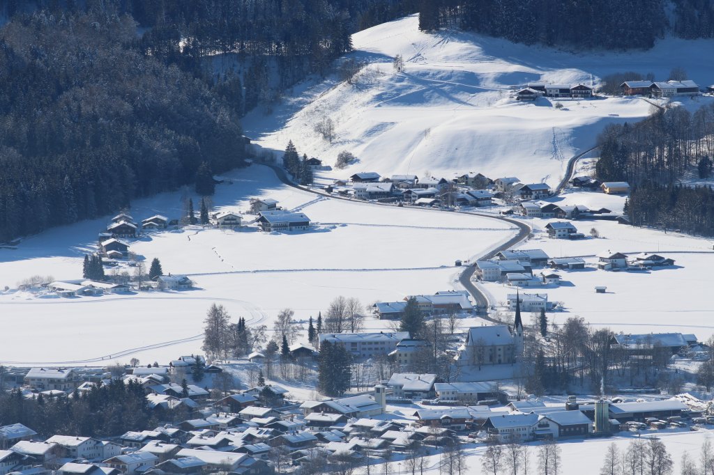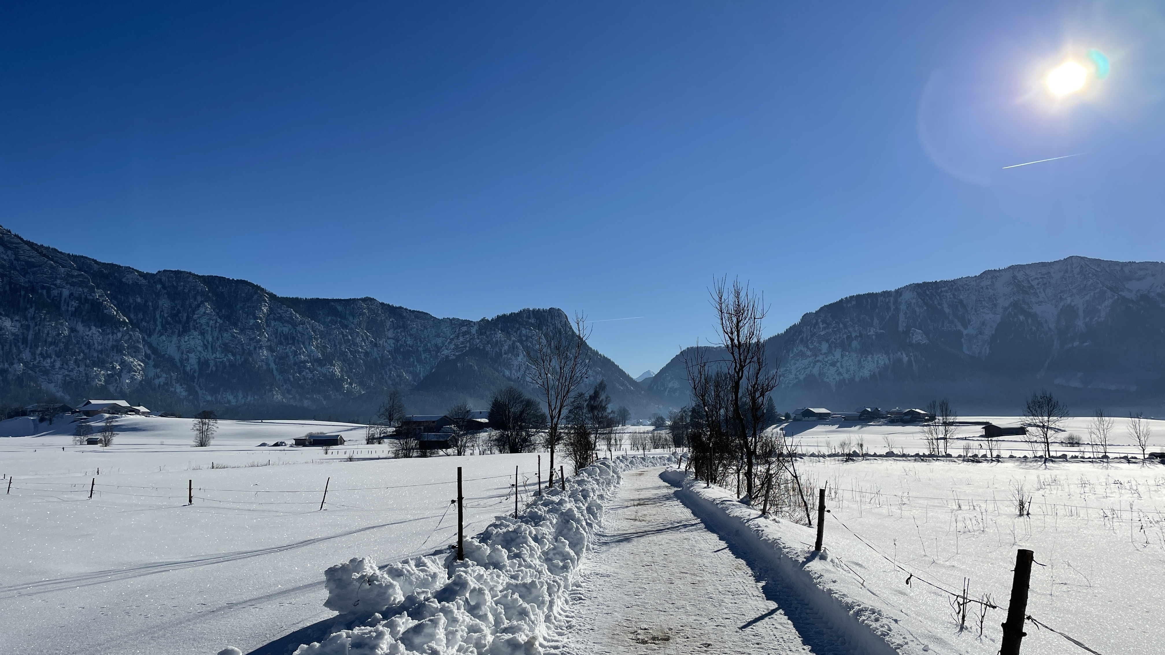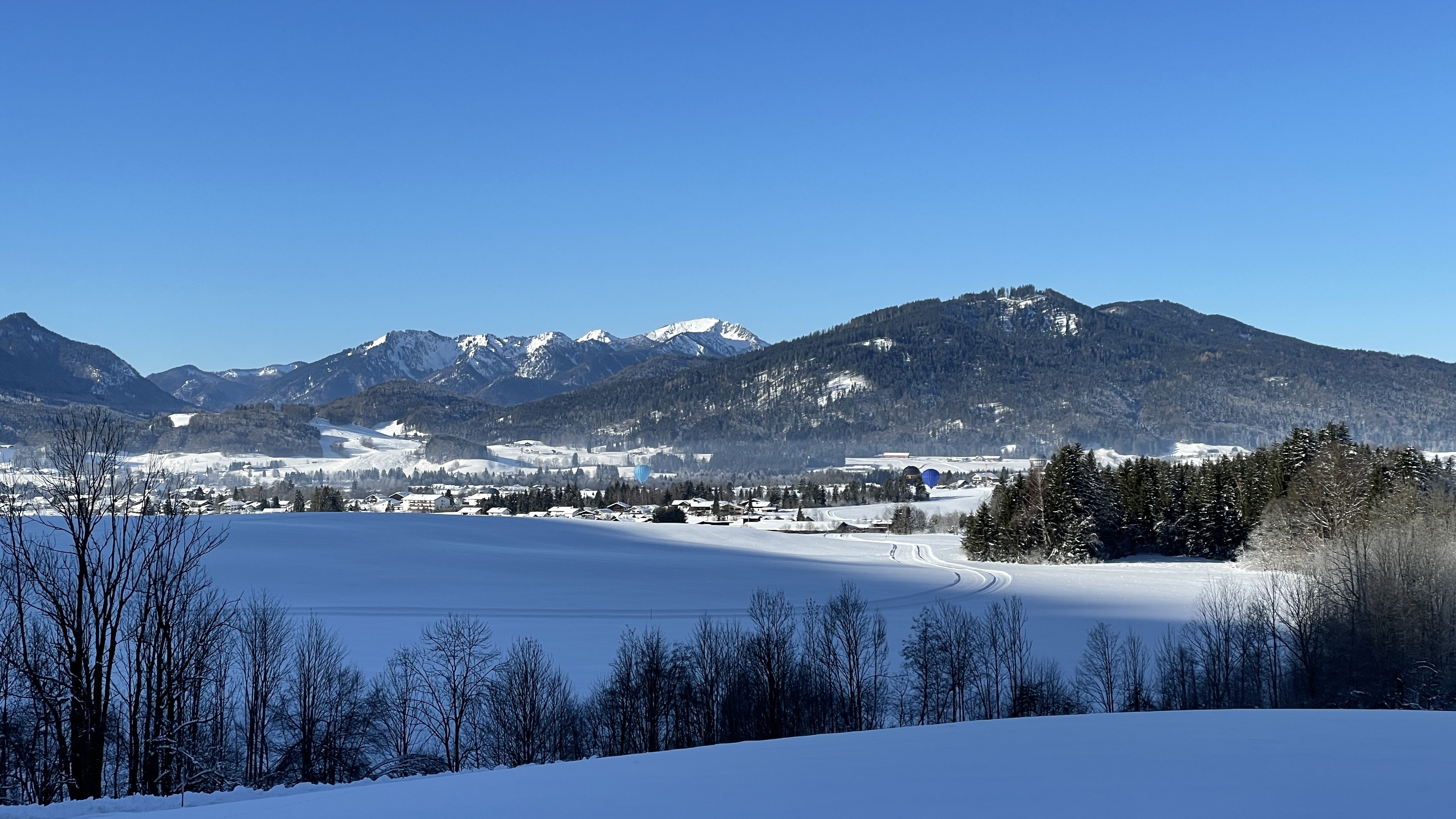 We reach the top of our tour around noon at 1024 m, where we have a great view over the Inzell valley and the mountains just beyond. We can see the two peaks that we circled yesterday, as well as our hotel at Inzell. It’s such a cliché, but the village is surrounded by a fluffy blanket of snow, with the outlying hamlets sticking out in gradations of brown and tan.