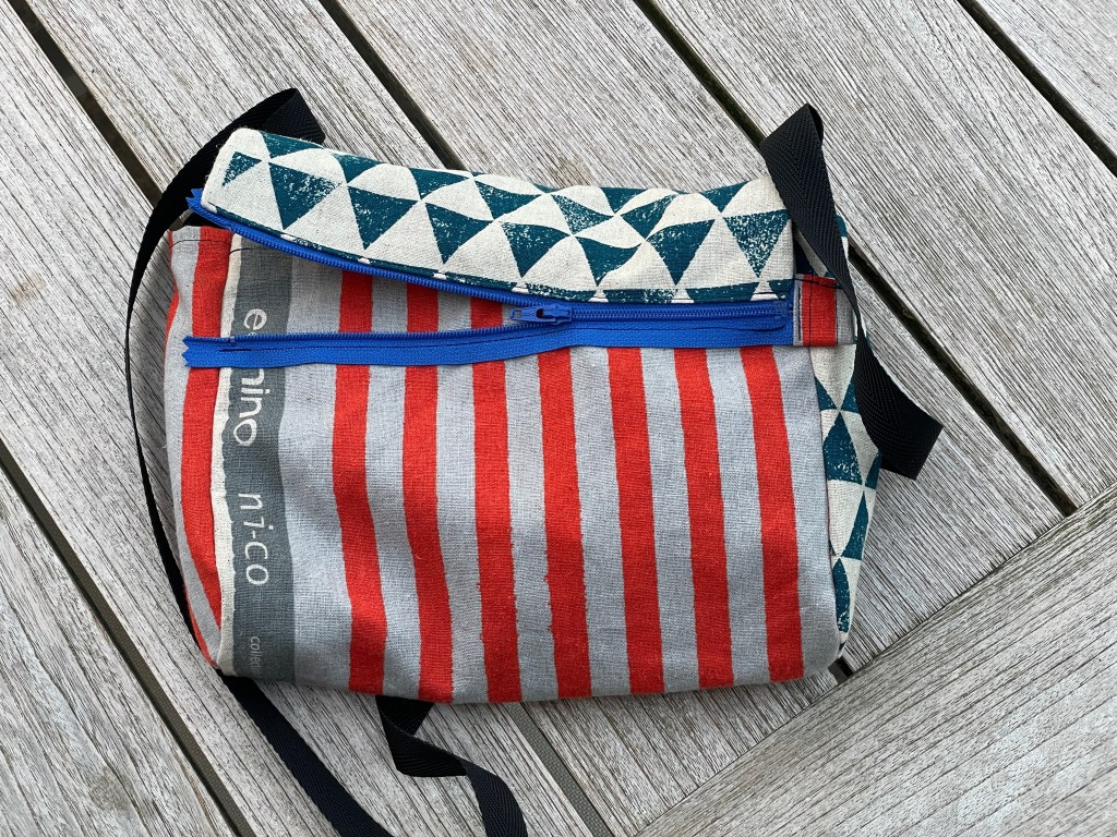 Packing seems a bit more chaotic than usual, don’t know why. Perhaps the hot weather makes us a bit more tired and irritable? I make a stack of the clothes I want to take, then discard half of them, thinking I can always do a quick wash halfway. Mom arrives and takes care of the final touches: we can’t fix my helmet but I can borrow hers, she sews a button on my new shorts to secure the phone in its thigh pouch and brings today’s eureka idea: a light cloth purse, that I can fold and stow away in my bike bags and then take out in the evening or on days off. She sewed it this afternoon based on two requirements: must be very lightweight / must have a zipper. She used a leftover piece of Japanese design cotton and it looks great, thanks Mom!