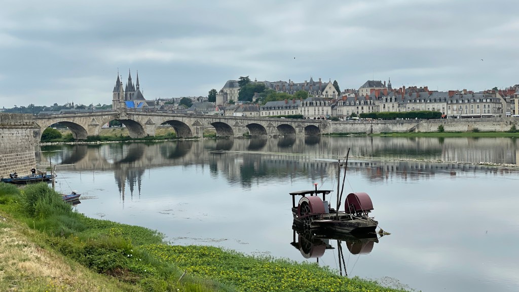 The day becomes sunnier and warmer as we approach Blois. The approach is a bit of a hassle, with many round points to be braved, the excellent infrastructure for cyclists along the Loire river is missing here, on approach from Chambord. Once we get to the banks of the Loire we are rewarded with a great view of the old city, with its 18th century bridge, a multitude of church towers sticking out of the sky line and of course the castle. Content to admire all of it from a far, we drive by the city towards today’s destination Veuzain-sur-Loire. Later, along the Beuvron tributary, full of flowering water plants, we spot two nutrias in the water. I am never travelling without my reflex camera ever again. Nutrias aren’t very rare these days, but it’s nice to see wild animals. My battery is now down to 12% and the autonomy only 10 km, but we have only a few kilometers to go anyway. A friendly young lady requests, as we drive by, that we fill in a questionnaire for the Loire à vélo association and I’m happy to do so, since their website was so useful when preparing the trip. We catch a glimpse of Chaumont castle from the bridge towards Veuzain, but try to ignore it, as we’ll pass this way again tomorrow morning.