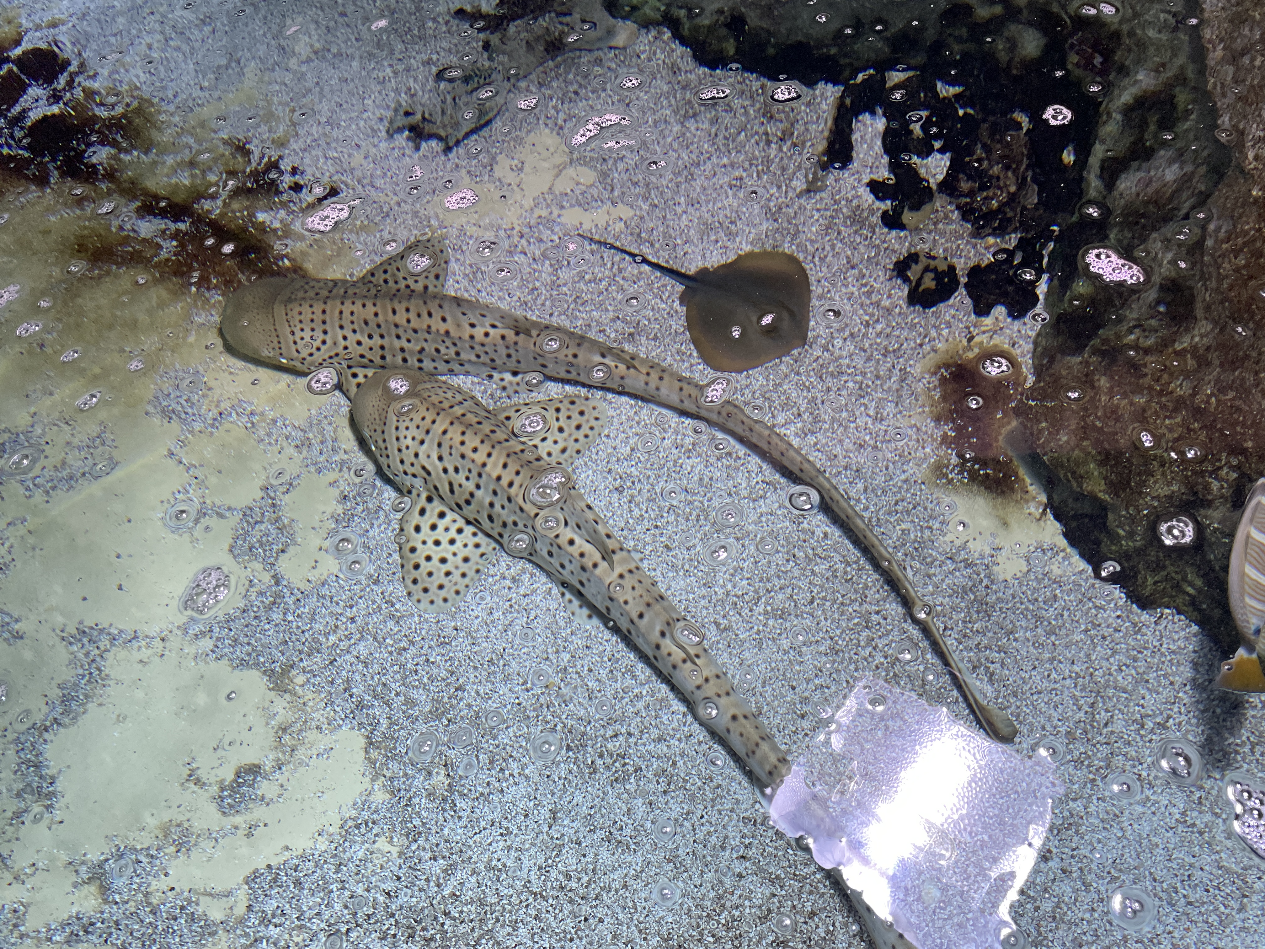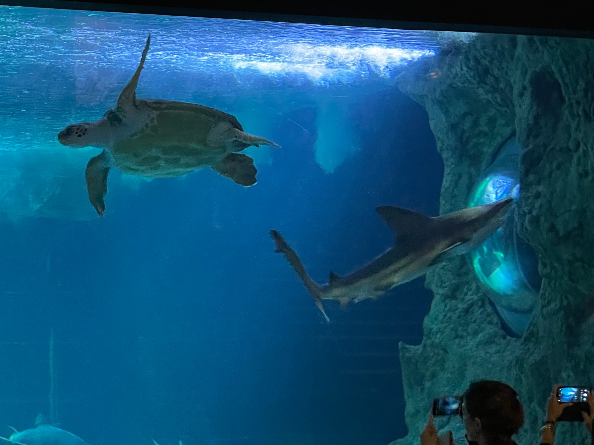 My eyelids pop up around seven fifteen, I throw the curtains wide, open the panoramic window and read until Arne wakes up. I found a book! I’ve started the Sirantha Jax series by Ann Aguirre, light and romantic science fiction, it’s a popular genre these days. We have breakfast around eight (one other table occupied in the huge breakfast room) then check out what we can do before our big lunch: there’s lots to do around here and we decide to visit the Océarium in Le Croisic, a few kilometers from here. When we arrive, there’s a few groups of school kids just entering, but they’re neatly herded by their teachers and guides so we manage to always be where they’re not and wander around in relative peace. It’s not the biggest aquarium we’ve visited, but it has an interesting section full of Canadian coastal biotopes (apparently an exchange project with an aquarium in Vancouver) and a two huge tanks with larger sharks.