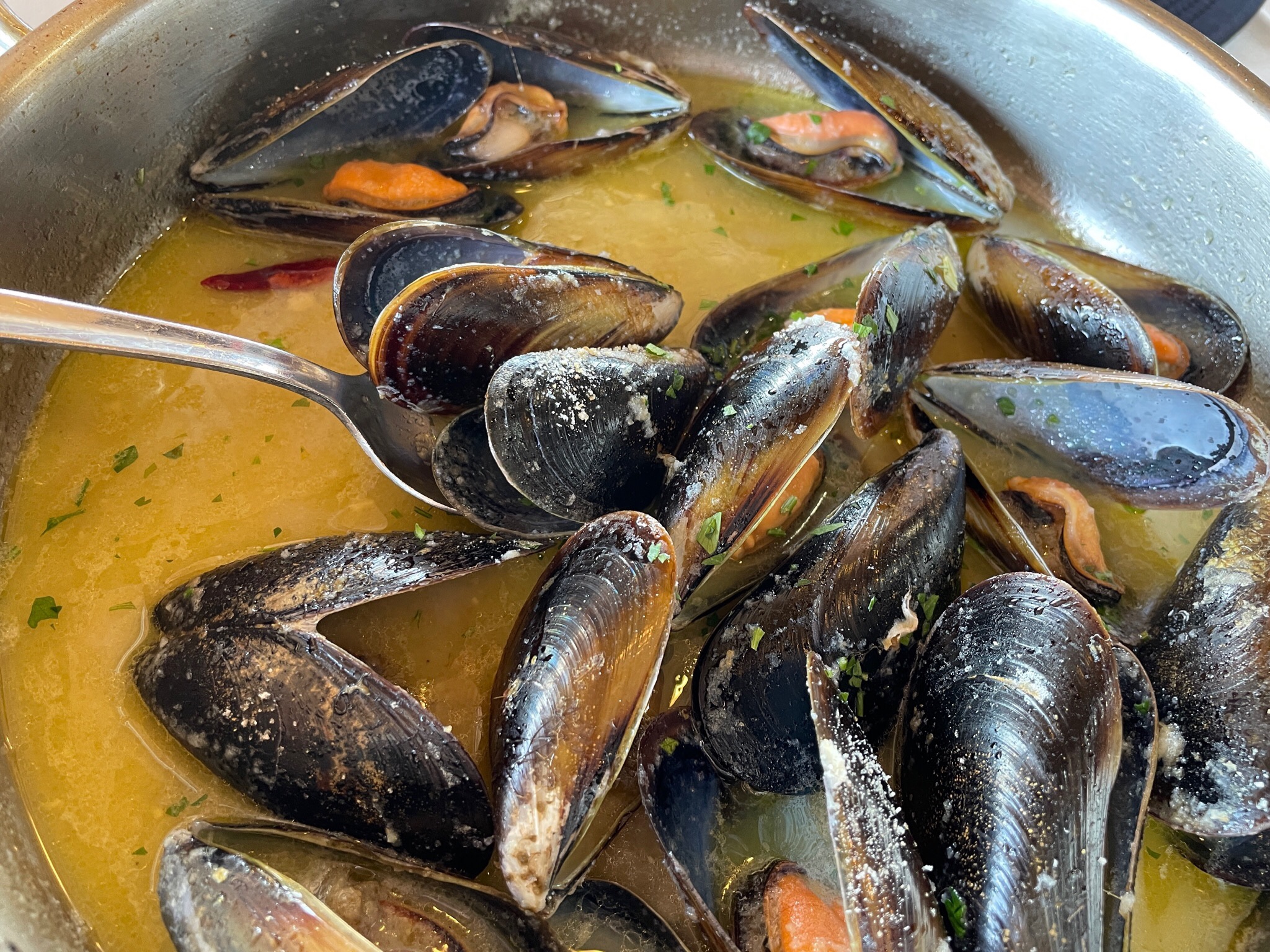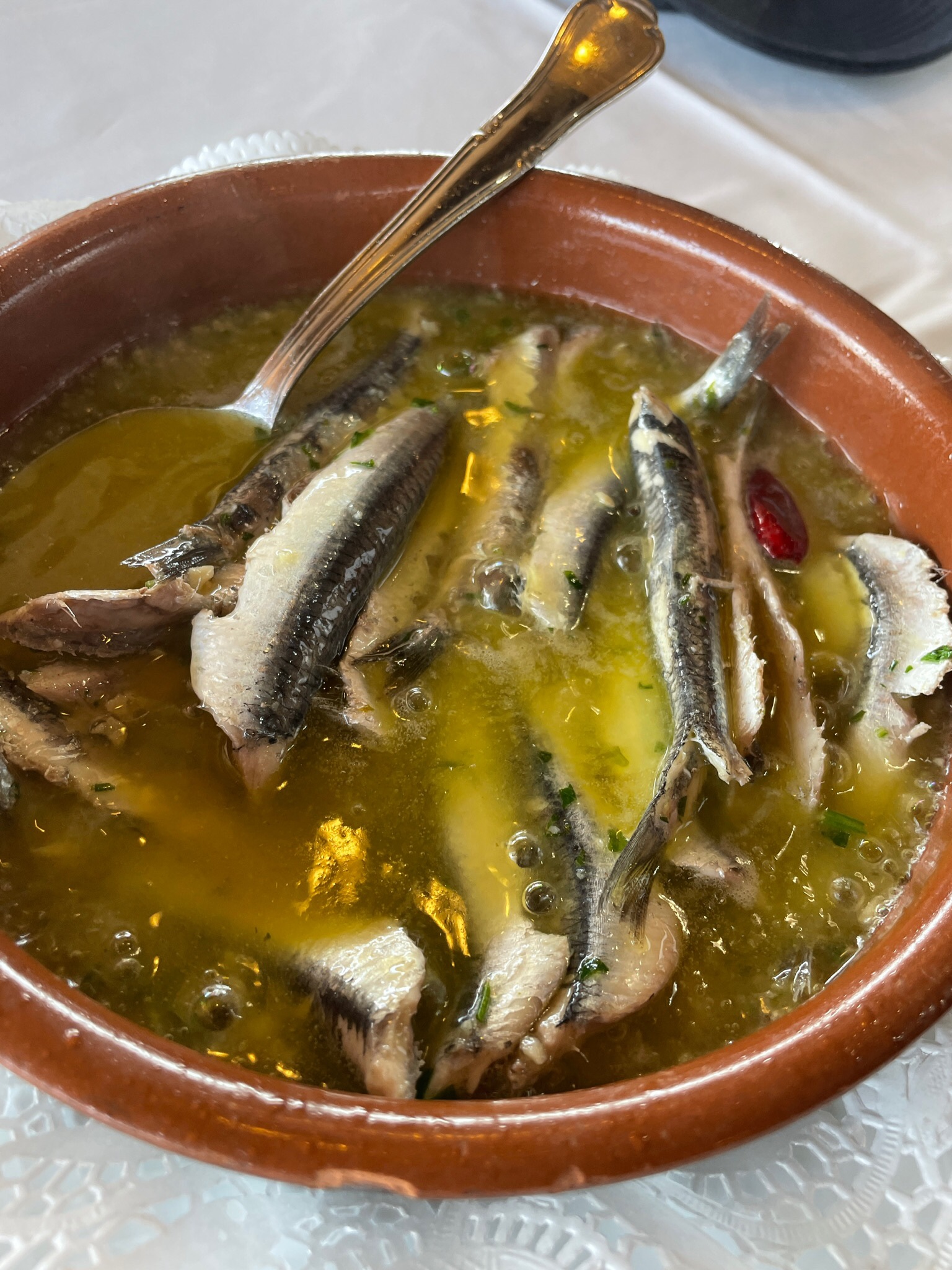Once on the other side, we follow the delightful coastal walkway, basking in the sun, admiring the early 20th C villa’s, chatting and laughing. We’re quite hungry, but we’ll have to wait until after two to find an open restaurant. We aim for Getxo port and arrive just in time. Lots of options here, we pick Parillas del Mar because it looks like it’s popular with locals. No tables available outside, but we are welcome inside, where we sit down to decypher the Spanish menu. We share mussels, anchovies and a turbot, in the typical basque style, where each dish is simply made, served without side dishes and with a total focus on one product. The lady brings the fish and fillets it at the table, handing us each a plate with fish, some of the butter sauce and fine garlic slices fried in it. Delicious! Delectable! Chock-full of flavor. Would eat more but I’m stuffed. No, there’s room for desert, always.