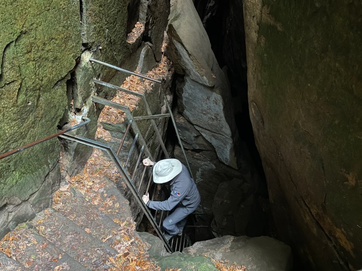 We decide to do the B2, a 4,2 km loop passing by some of the local highlights. It’s a bit short, but the lady said that a few kilometres will be added if we visit the sights along the way. We follow the signposts and immediately descend into a maze of narrow, deep gorges, cut out by water from the sandstone plateau upon which Berdorf presides. We climb up and down ladders and rock-hewn stairs, switching from the humid, cool depths to the forested plateau. From below you can hardly see the top of the cliffs, sometimes 50 m high. From above you can’t even see the gorges, until you arrive right at the edge of a ravine.