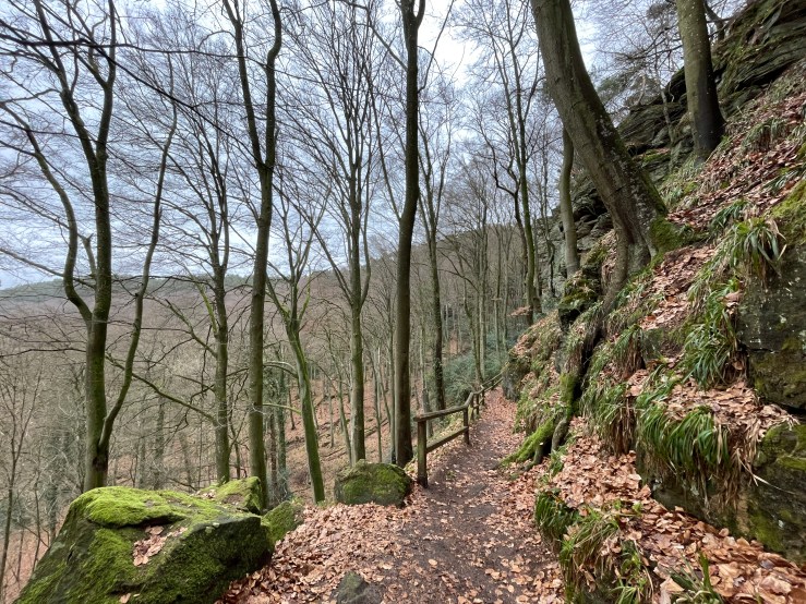 The area is definitely well developed for tourists. There’s hiking trails, mountain bike trails, rock climbing trails, each with their own flyers and websites. We contour the rock massif, walking below the cliffs, looking out over river valley with fields and the occasional charming house. Not a lot of animals to be seen, though the small birds are making a lot of noise. We do spot a robin, posing prettily amidst a jumble of old wood, some small tits flitting about (too far away to take a good picture) and two circling buzzards. The weather remains cloudy, but mostly dry, must be about 10° C. Oddly suitable for this environment, gloomy and humid.