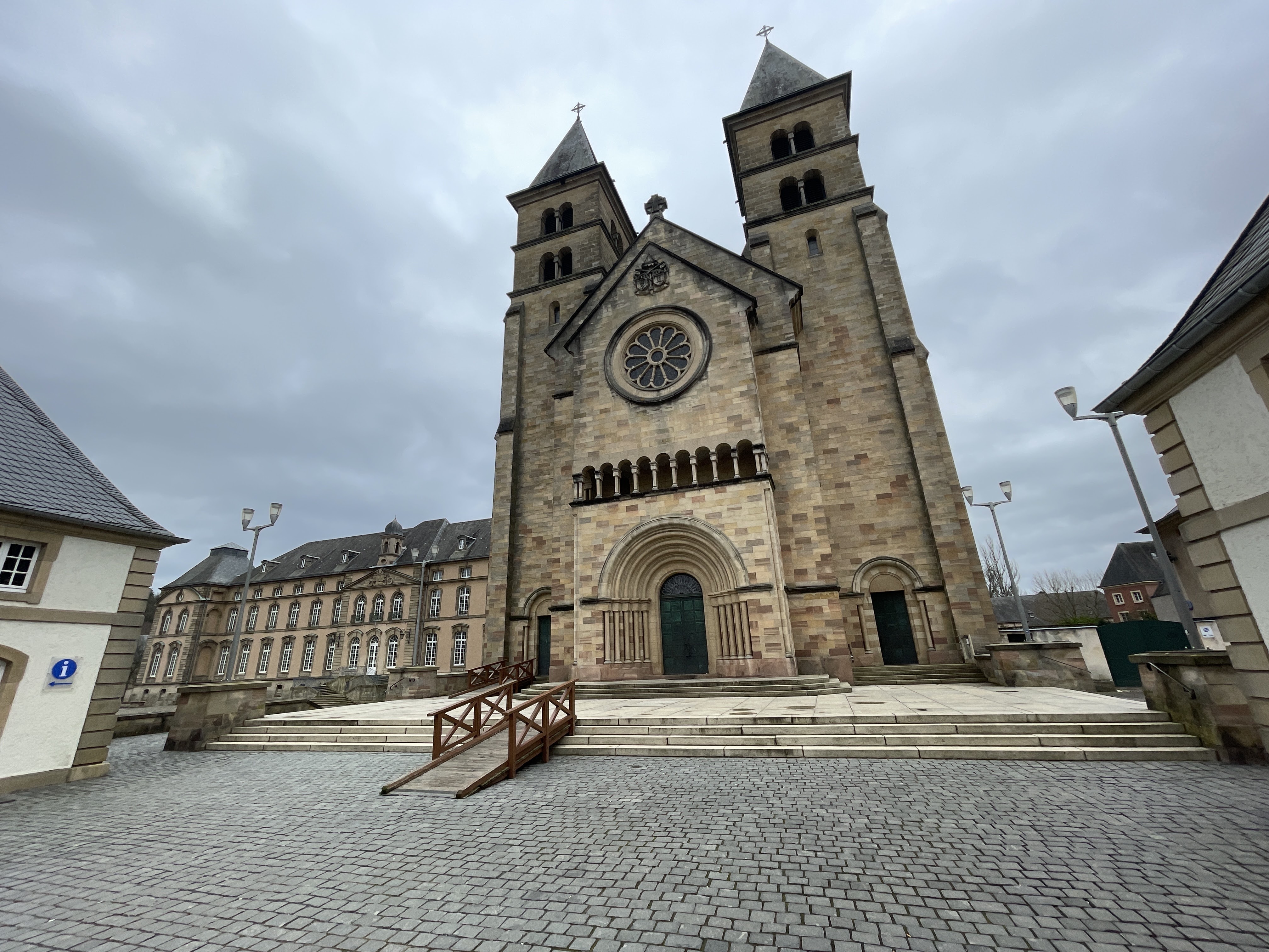 It’s cloudy but not raining, about 10° C, so I am pleasantly warm with three woolly layers and a thick down body warmer. Plus, my big camera backpack keeps the wind of my back. Slowly we descend towards the Sure river, making the final approach to Echternach by climbing the sides of the gorge to a viewpoint above the small city. We can clearly see the major tourist attraction: the basilica with the reliquary of Saint Willibrord, who founded an abbey here in the 7th century. We follow a narrow, steep, cobble stone path down to the center, looking for lunch, just as we hear the carillon play a jaunty tune, followed by 12 deep gongs, we’re just in time. We encounter another one of those typical bakeries (this one founded in 1913) and we’re lured in by the selection of sandwiches and pies. I have a small sandwich, just so I’d feel justified in also having an eclair, delicious. We start encountering some of the same people we saw on the walk.. it looks like everybody is following the same trail (and visiting the same bakery). This is going to be a theme the rest of the day, some groups we’ll encounter even thrice.