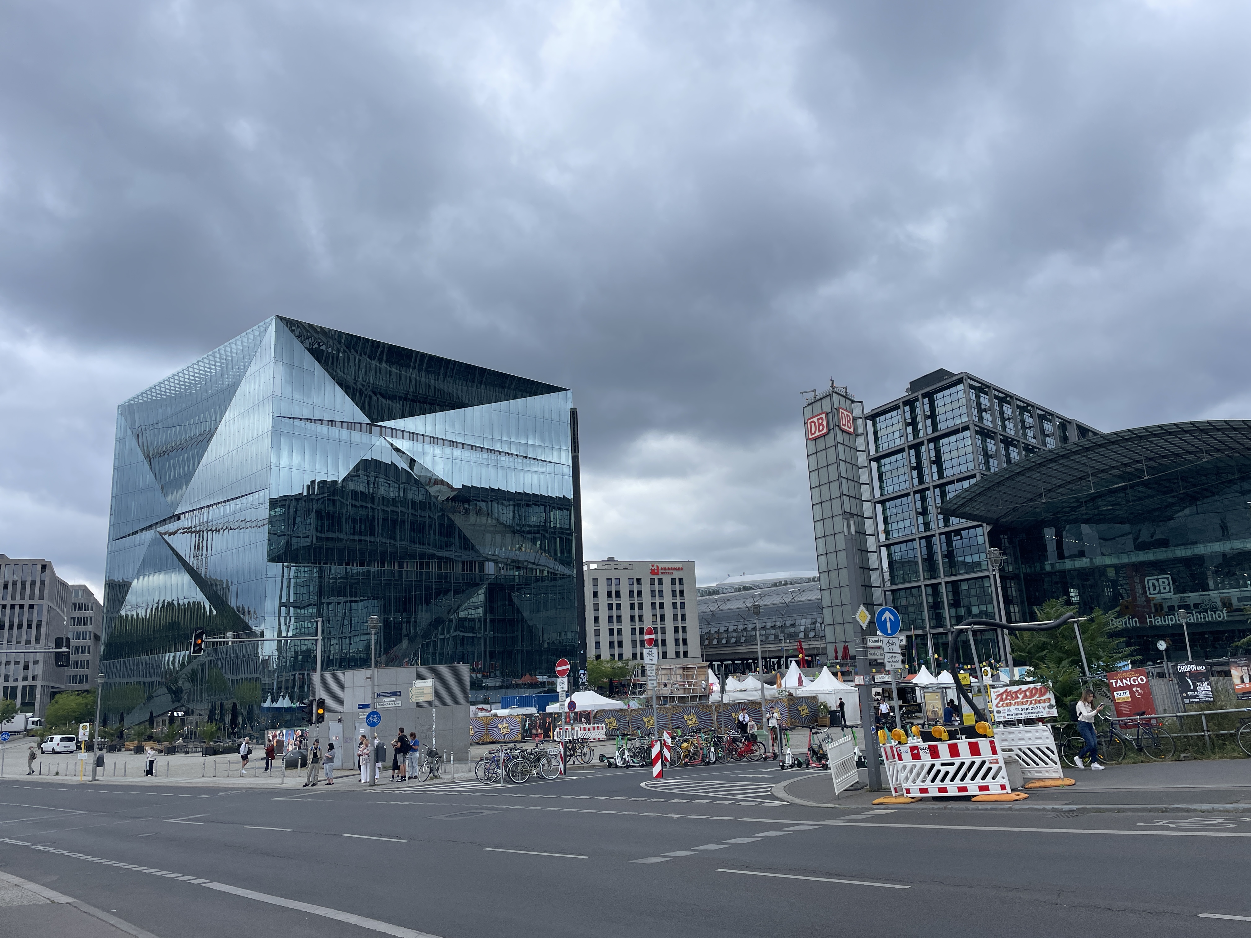 Having asked Google which rail line to take, we walk out around nine to see the Hanzaviertel, a neighbourhood built from scratch in the fifties by then-famous architects. The line is closed about halfway, which we only notice when everybody in the carriage ups and leaves at the same time. We can’t quite understand from the info signs about why and what alternatives they propose, so we decide to walk to the Hauptbahnhof (the main railway station), which is the next station on the line we want. It’s a blustery day, though fortunately not raining. It’s just about warm enough for a tshirt, but I have to hold on to my panama hat at times. We enjoy the walk by the Spree river, the views of the Reichstag, the bustle of joggers and commuters. A lot of this area is reserved for cyclists and walkers, really pleasant.