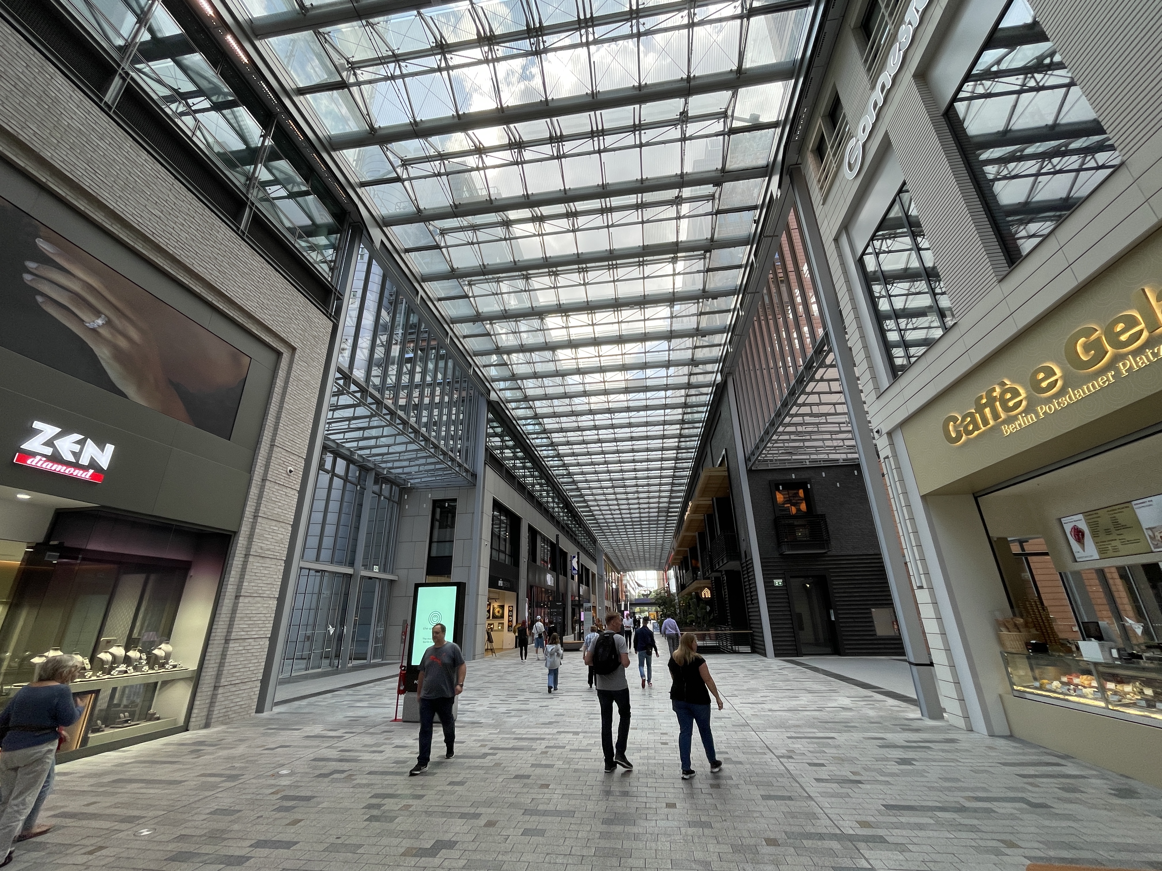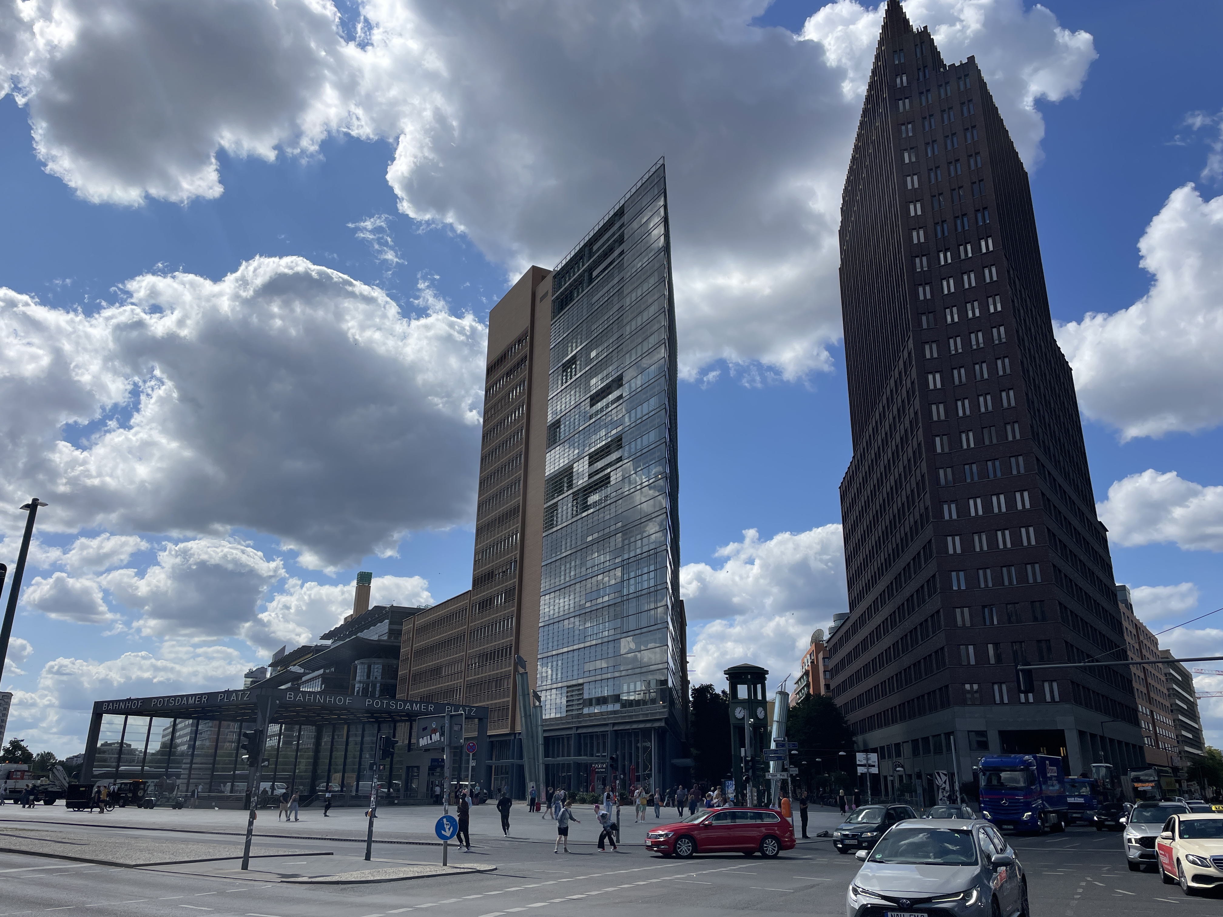 We end at the Hansaplatz subway station and hop on to go the the Potsdamer Platz. It has a long and complicated history which we’re completely ignoring now, except to note that after the fall of the wall there was suddenly a large, attractively located piece of land available. After the government approved a master plan in the nineties, the architect Renzo Piano made a high level design, delegated some of the buildings to other famous architects and designed one himself. The result is a light and open area busy with traffic, surrounded by modern high rises in different, but still somehow matching styles. There’s a lot of tourists, but also a lot of locals who work in one of the high rises, it’s a lively mix.