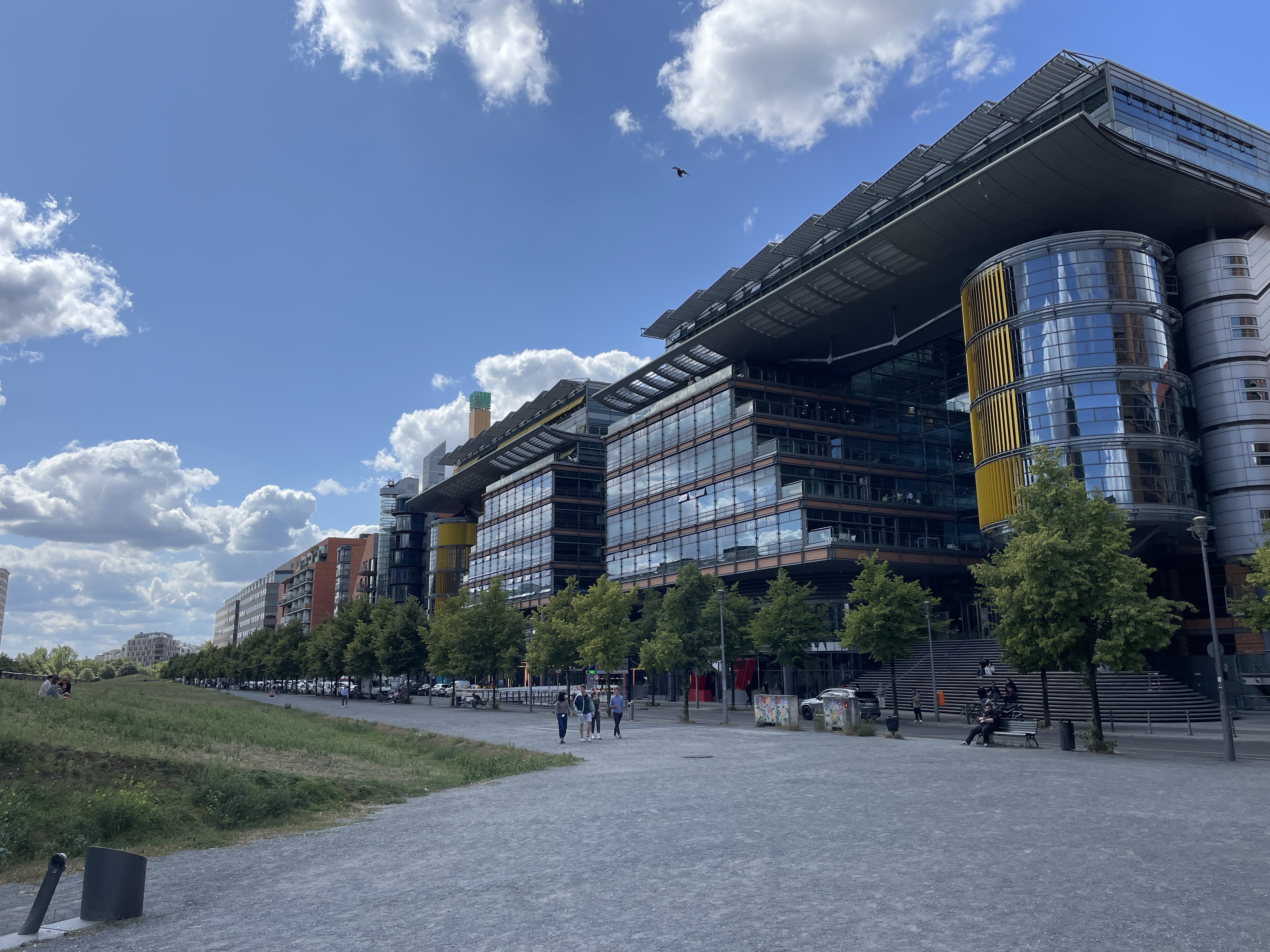 The Hauptbahnhof is a new building and this whole area has been upgraded since then. There’s an impressive modern building right in front of it, Google says this is the 3XN office building and their website has interesting info about the design, just fascinating. We visit the train station to use the toilets (1 EUR, but very clean) and check if we can continue our way by S-train from here, but no such luck, so we continue on foot, about thirty minutes still to our destination.