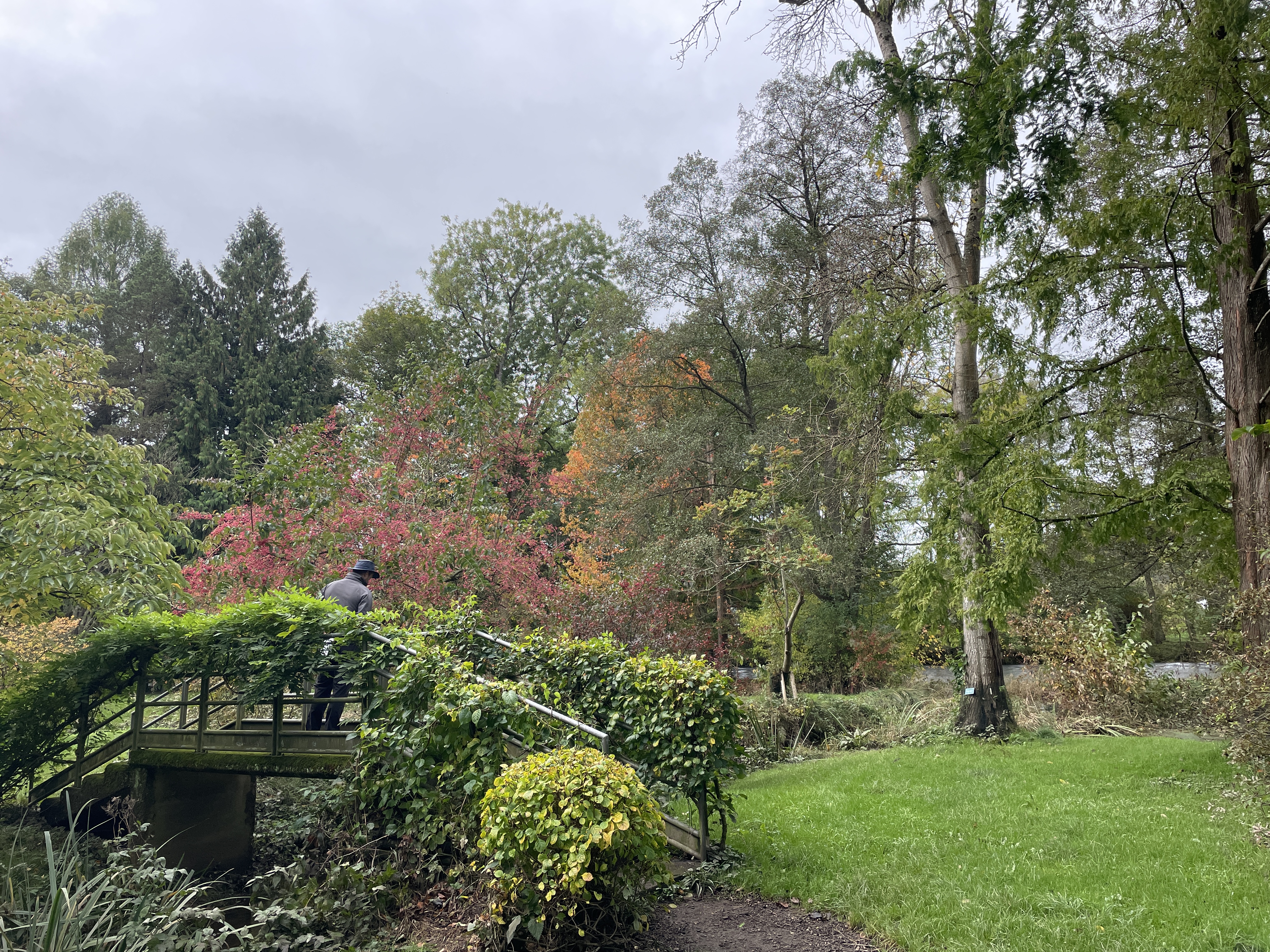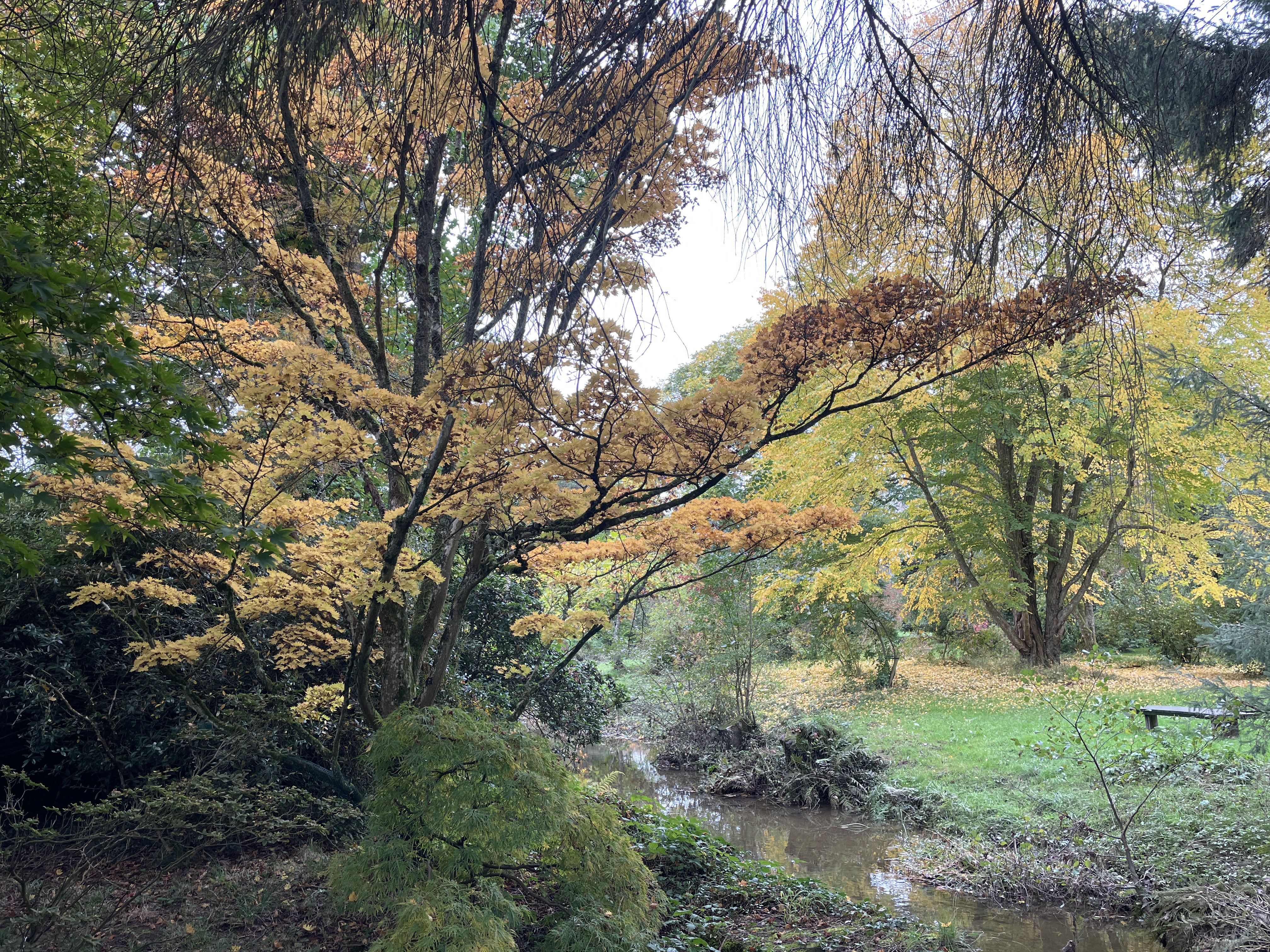 Without further ado, we pick one of the five loops and start walking. Les îlots de l’Ourthe – or the islets in the Ourthe river – is the oldest part and it’s full of smaller trees, specifically a large collection of Euonymus varieties, Acer palmatus and various other variaties and rhododendrons. Though the grass and undergrowth between the trees is not knee-high, there’s no actual path and we take this as permission to wander freely, occasionally ducking under branches to read the ancient plates declaring the latin name of the shrub and when it was planted. We don’t know whether to be disheartened or intimidated when we encounter thirty to sixty year old specimens of trees we have in our own garden. The comforting alternative way of looking at it is that we won’t be around anymore to deal with the Japanese maples having outgrown their spot under the big oak at home. Both the Acer and Euonymus trees/shrubs (I’m never sure where the border is) are known for their bright fall leaf colours and, so it’s an incredibly colourful scene, with bright reds, oranges and yellows. It’s the perfect time to be here: late enough for the bright colours, but early enough for the leaves to remain on the trees. The Ourthe river must have recently overflowed, we see accumulated debris against the protective netting around the tree trunks and a weirdly level line of grey dirt on the lower tree leaves.